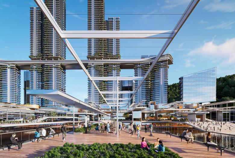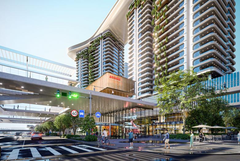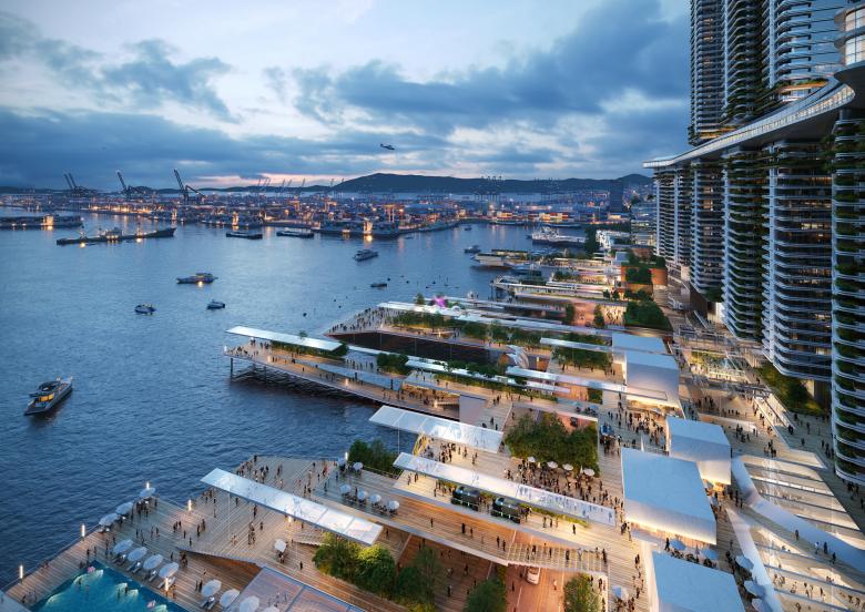 Towering elegantly along the waterfront, an iconic architectural masterpiece, stands as a visual icon, welcoming visitors who arrive by sea. Drawing inspiration from the container terminals' portainers, four high-rise residential towers are interconnected by a skydeck at above 100 meters. This innovative design creates the illusion of a 'floating city' against the horizon. While partially serving as a private club facility for residents, the skydeck also offers public access via separate lifts, ensuring that this unique space can be enjoyed by all.