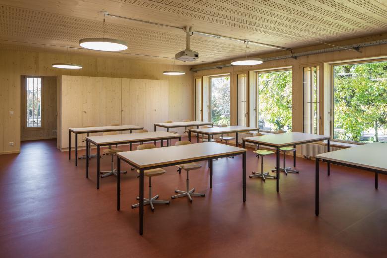 Der kompakte, zweigeschossige Baukörper aus Holz liegt etwas von der Schubertstrasse zurückversetzt und bildet auf drei Seiten Aussenräume mit unterschiedlichen Stimmungen. Eine hohe, zweiseitig belichtete Eingangshalle bildet die Mitte des Schulhauses. Sie dient ebenso als Garderobe, Erschliessungsfläche, gedeckte Pausenhalle und thermische Pufferzone. Die Wände und Decken der Räume zeigen ihre konstruktiv eingesetzten Mehrschichtholz- und Duripanelplatten ohne Oberflächenveredelungen. Das Zusammenspiel des dunkelrot-braunen Linoleumbodens mit dem rohen Holz erzeugt in den Schulzimmern eine warme, kreative Atelierstimmung.