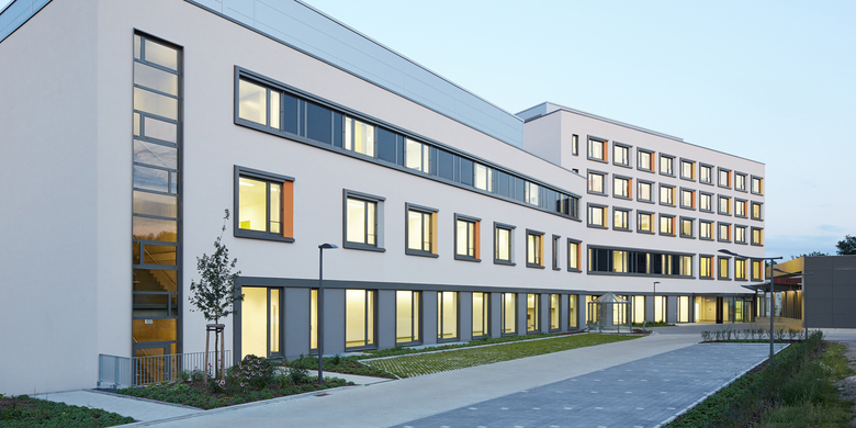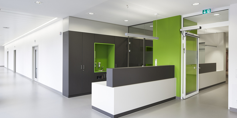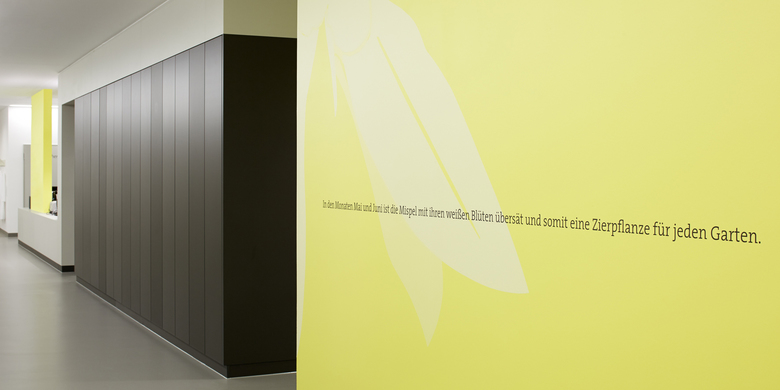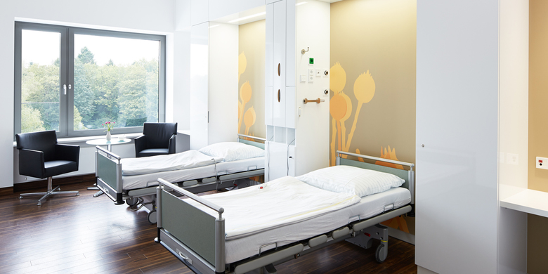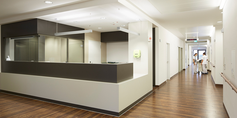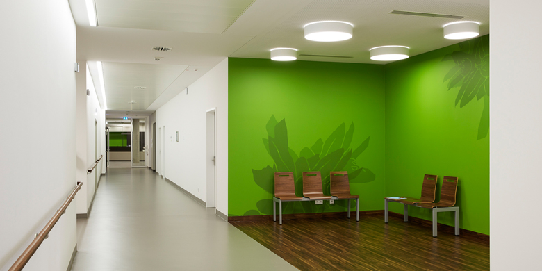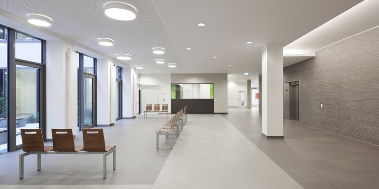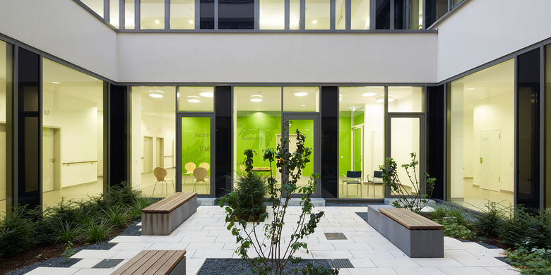 Das äußere Erscheinungsbild des Krankenhauses wird straßenseitig kaum verändert. Die Erweiterungsbauten werden als kompakte Strukturen auf die Gartenseite des Geländes angeordnet. Dadurch entstehen zwei quaderförmige Kuben, wovon einer in allen Ebenen durch einen Rundlauf horizontal erschlossen wird und somit kürzeste Wegebeziehungen ermöglicht. Über Lichthöfe werden nahezu alle Räume mit direktem Tageslicht versorgt und die Orientierung erleichtert.