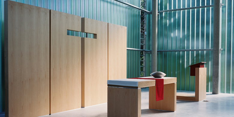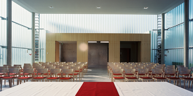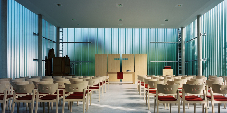 Hier ist eine unkonventionelle, aber äußerst reizvolle moderne Kirche entstanden, die zu jeder Tages- und Jahreszeit durch die semitransparente Fassade eine eigene Wirkung hat. Auch die Akustik ist gut, obendrein war es mit 430.000 Euro Gesamtkosten eine ausgesprochen preiswerte Lösung.