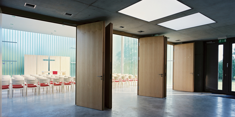 Das Foyer mit Sichtbetonwänden dient als Verbindung zwischen dem bestehenden Gemeindezentrum und der neuen Kirche. Es leitet über in den lichtdurchfluteten, quaderförmigen Sakralraum, der durch seine reduzierte Materialwahl besticht. Ein flügelgeglätteter Betonboden als Fundament, zwei Reihen Sichtbetonstützen, die das Dach tragen, eine schlichte weiße Decke mit eingebauter Beleuchtung und eine helle, schlichte Möblierung mit dem wohltuenden rot der Sitzkissen als Akzentfarbe.
