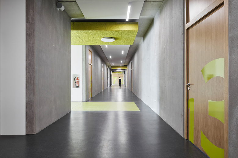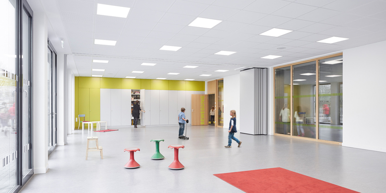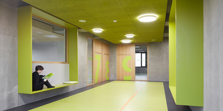 Zurück zum Eingang führt die Haupttreppe direkt nach oben zur Verwaltung mit dem Sekretariat. Geleitet durch „grüne Zungen“, wie die a|sh Architekten die Deckensegel nennen, die in die Flure hineinragen, wird der Besucher vom Flur aus zu den Funktions- und Aufenthaltsbereichen wie Garderobe und Frühstücksplatz geleitet. Die Flure werden so zu Differenzierungsräumen, die zusammen mit Clustern und Klassen den Lernbereich bilden. Hier können sich die Kinder innerhalb der freien Arbeit ihren individuellen Lernraum aussuchen.