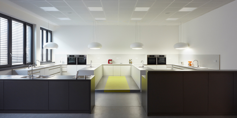 Das Gebäude liegt an einem Hang. Über den Vorplatz vorbei an der Mensa geht’s zum unteren Haupteingang der Schule. Dieser führt zunächst in die öffentlichen Bereiche. Am Infoboard vorbei durch die Pausenhalle gelangt man zum Herzstück - die Mensa. Ein Blick hinein zeigt einen lichtdurchfluteten hellen Raum und lässt liebevoll gestaltete Details entdecken. Ein grüner Mäander führt von der Ausgabetheke über den Boden und wird eins mit einem Möbelelement. Es zoniert und verbindet zugleich. Lichthöfe lassen den Musikraum und die Lehrküche der unteren Ebene zu einem besonderen Ort für gemeinsames Musizieren und Kochen werden. Spezielle Akustiksegel an Wänden und Decken sorgen im Musikraum für den perfekten Sound. Die großzügig ausgestattete Lehrküche bietet durch ein Podest die richtige Arbeitshöhe für Groß und Klein.