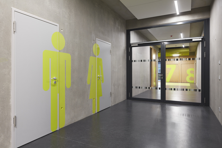 In der weiterführenden Schule tanzen große Zahlen über die Türen. Planetennamen wie „Saturn“ und „Merkur“ weisen die Grundschüler in ihre Klassen. Fachräume und Räume für das Bewegungs- und Entspannungsangebot der Ganztagsschule sind mit großen Buchstaben beschriftet – „BEWEGUNG“, „WERKEN“, „TEXTILES GESTALTEN“, „BIBLIOTHEK“. Sie lassen das vielseitige Angebot erkennen. Über den oberen Ausgang verlässt man das Gebäude. Wer aufmerksam schaut, der entdeckt, dass die Zungen des Inneren nach außen führen und sich als grüne Farbflächen in der Fassadengestaltung wiederfinden.