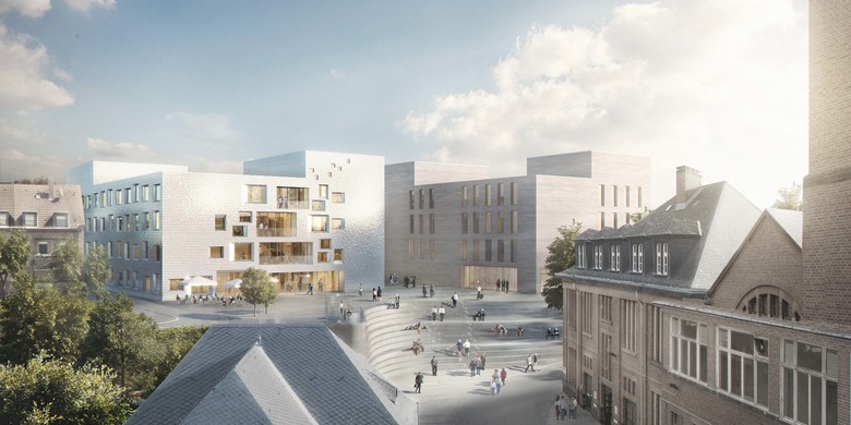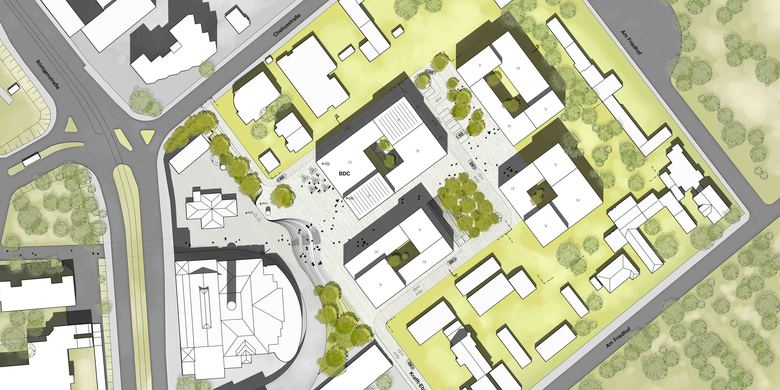 Das künftige Campus-Gelände verfügt mit seinen unterschiedlichen Plätzen und Gassen über eine hohe Aufenthaltsqualität. Das BDC wird darin so platziert, dass über die zentrale Sichtachse ein klarer Bezug zum Universitätsklinikum hergestellt wird. Der Hauptplatz wird insbesondere von der Inszenierung des alten Kesselhauses, der Sichtbeziehung zum Klinikum sowie einer großen Freitreppe geprägt. Diese in Form einer eleganten Kurve angelegte Treppe verschmilzt mit dem Gelände und wird, um die Wirkung als Landschaftselement zu betonen, im südöstlichen Bereich bepflanzt.