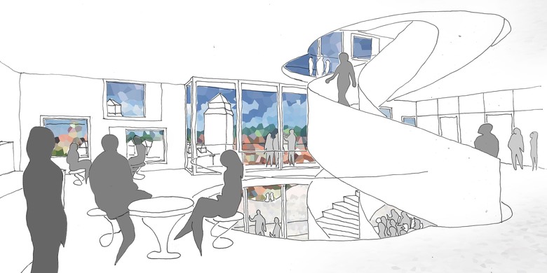 Die Kommunikationszonen in den Obergeschossen bündeln alle Gemeinschaftsfunktionen wie die Teeküche und einen Besprechungsraum. Den Mittelpunkt bildet eine über alle Geschosse reichende, repräsentative Wendeltreppe. Die kommunikativen Bereiche des BDC verfügen über großzügige Fassadenöffnungen und ermöglichen Aus- und Einblicke sowie den Sichtbezug zum Uni-Campus und zum Kesselhaus. Die Fassade wird mit Schindeln aus heller Keramik mit einem leichten Perlmutteffekt verkleidet, was die Maßstäblichkeit der Ziegelstruktur der historischen Gebäude aufnimmt. Durch die Oberfläche des Materials wird die Umgebung andeutungsweise und spannungsreich in der Fassade reflektiert.