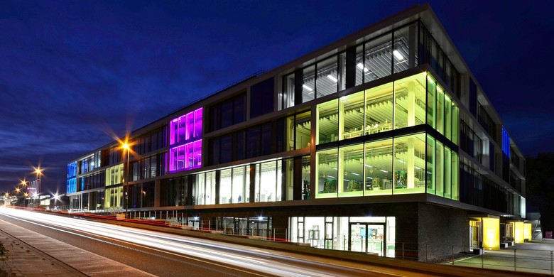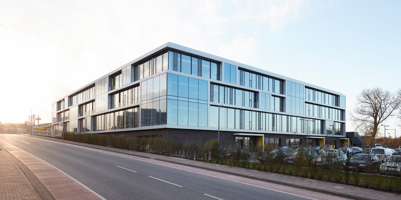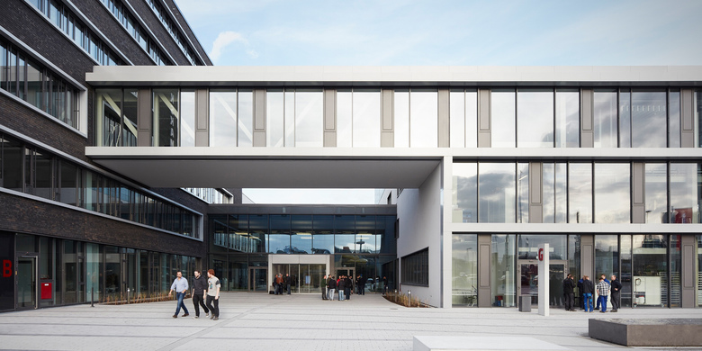 Die beiden Bauteile des neuen Gebäudes sind unterschiedlichen Funktionsbereichen vorbehalten. Der höhere, siebengeschossige Bauteil mit seiner fast quadratischen Grundfläche dominiert den Vorplatz. Den monolithischen Massivbau prägen eine dunkle Klinkerfassade und horizontale Fensterbänder. Eine großformatige Pfosten-Riegel-Glasfassade, die sich im Schulungsbereich über zwei Geschosse erstreckt, ermöglicht Ein- und Ausblicke. Diese Transparenz lockert das klare Entwurfskonzept auf. Die anthrazitfarbenen, kleinformatigen Klinker, die im traditionellen Wasserstrichverfahren hergestellt wurden, setzen zudem einen starken handwerklichen Akzent.
