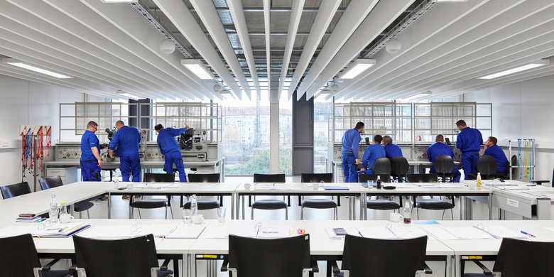 Der flachere, viergeschossige Bauteil beherbergt die Werkstätten und Ausbildungsbereiche. Im zweiten Obergeschoss ist das Werkstattgebäude mit dem Verwaltungsgebäude über eine verglaste Spange verbunden, die sich über den Haupteingang spannt. Die technische Funktion des Bauteils spiegelt sich auch hier in der äußeren Gestaltung wider. Ab dem Sockelgeschoß bietet der Werkstattbau durch raumhohe Fenster Einblicke in den Arbeitsbetrieb. Die Pfosten-Riegel- Fassade mit Vor- und Rücksprüngen und rahmenden Blechverkleidungen verleiht dem Gebäudeteil eine dreidimensionale Wirkung.