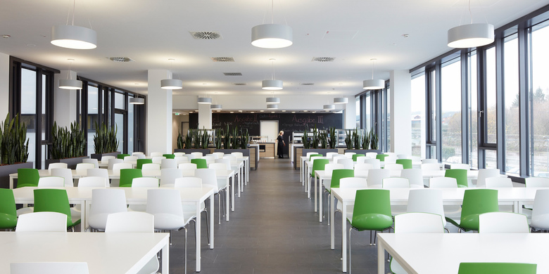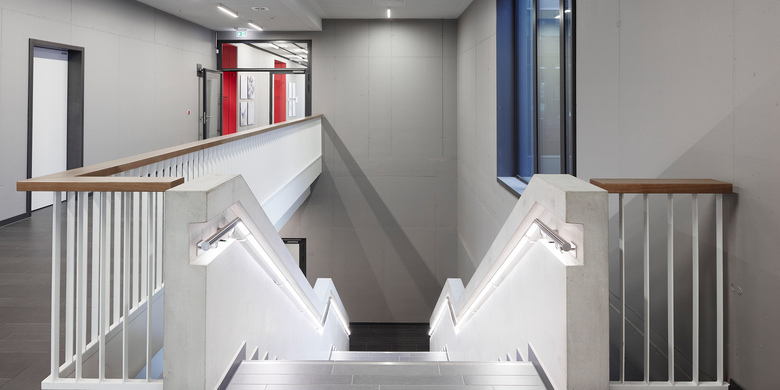 Im Inneren bietet der Neubau Platz für Verwaltung, Verpflegungsbereiche und Schulungsräume sowie eine Gästeebene mit 35 Einzelzimmern und einer Gästewohnung. Die Verwaltung ist in den oberen beiden Stockwerken des Hochbaus untergebracht, hier befinden sich Arbeitsplätze für 140 Mitarbeiter. Die Aufteilung erfolgte nach dem Open Space- Konzept, bei dem kleinere Einheiten in einem Großraumbüro zusammengefasst sind. Hinzu kommen Team- und Steharbeitszonen, Kreativecken und Ruhezonen.