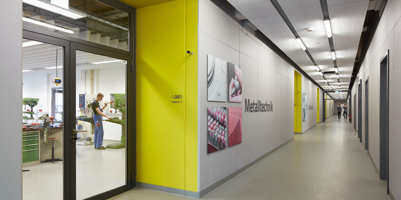 Die quadratischen, rhythmisierend angeordneten Schaufenster werden bei Dunkelheit farbig illuminiert und wecken das Interesse, einen Blick in das Gebäude zu werfen. Für das Handwerk dient es daher als gebaute Visitenkarte, um Nachwuchskräfte zu generieren und die Attraktivität der handwerklichen Ausbildungsberufe zu steigern. Die Innenraumgestaltung orientiert sich an den Anforderungen und Bedürfnissen der Ausbildung in Werkstätten und hebt diese Charakteristika auch optisch hervor. So wurden alle Versorgungsmedien für Strom, Wasser und Gas sowie die Be- und Entlüftung der Räume bewusst sichtbar gemacht, um den Werkstattcharakter zu betonen.