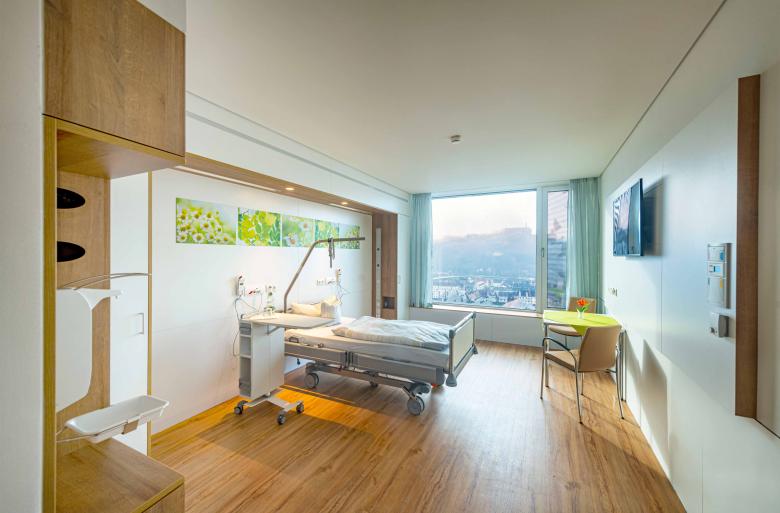 Alle Pflegezimmer sind so ausgerichtet, dass Ausblick in Richtung Plassenburg und in die Rotmainauen besteht. Die fünf Pflegegeschosse erhalten eine zeitlose, klar strukturierte Gestaltung mit einer gut proportionierten Lochfassade. Bewusst wird gegen die bestehende Bandfassade eine moderne Strukturfassade gesetzt, die einerseits in der Breite das Raster der Zimmer aufgreift und in der Höhe auf den Wunsch nach einer „barrierearmen“ Brüstungshöhe von ca. 0,50 m reagiert, um auch Patienten im Bett oder Stuhl den Ausblick zu gewährleisten. Die fein detaillierten Panoramafenster geben den Blick in den Landschaftsraum frei.