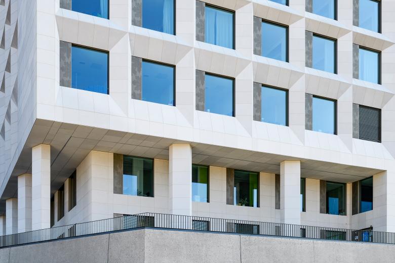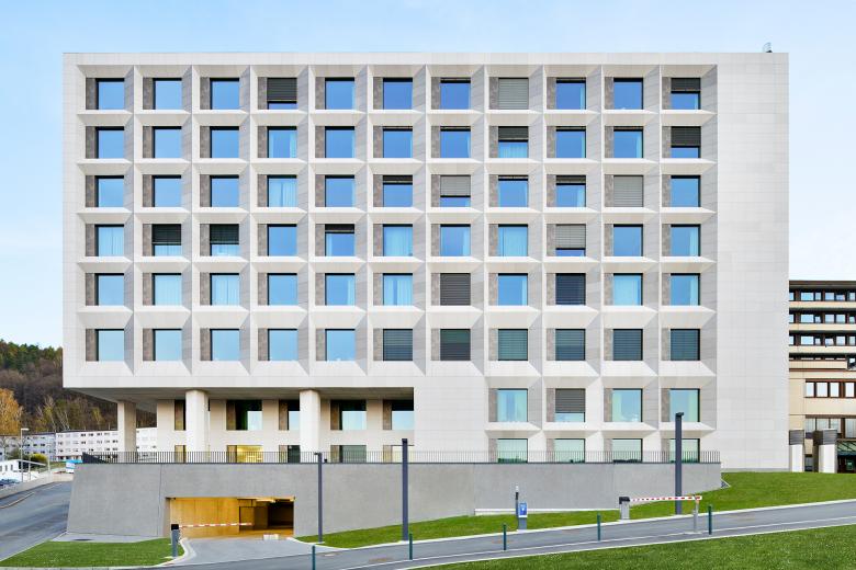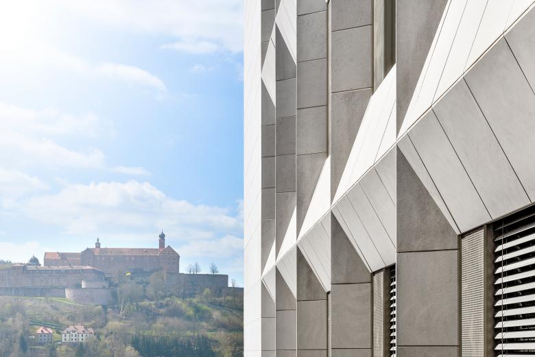 Viel Wert legte man auch auf die Verwendung natürlicher Materialien: So finden sich beispielsweise im Innenraum Holzwerkstoffplatten mit HPL-Beschichtung in Holzoptik als Fußbodenbelag, für das Mobiliar und in den Türlaibungen. Auch in der Fassade setzt sich dieses Konzept in der Verwendung des nachhaltigen Baustoffes Naturstein fort: Es wurde eine hinterlüftete, vorgehängte Fassade aus Natursteinplatten gewählt, die durch die geschlossenen und besandeten, schlanken Fugen ein sehr homogenes Bild erzeugt. Diese Optik bildet mit ihrer skulpturartig anmutenden Erscheinung den Spannungsbogen zum gegenüberliegenden Hügel und dem dort thronenden Wahrzeichen der Stadt Kulmbach, der sandsteinfarbenen Plassenburg.
