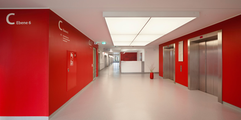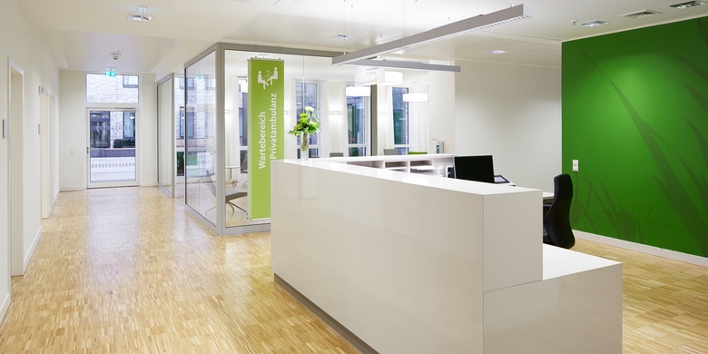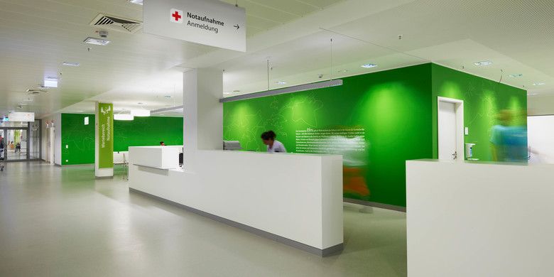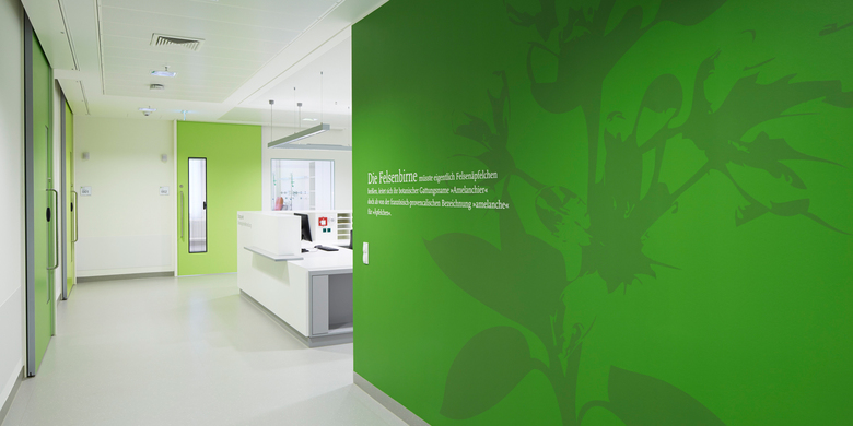 Große Beachtung schenkten die Innenarchitekten auch der Orientierung im Gebäude, vier Leitfarben helfen den Patienten und Besuchern sich problemlos zurechtzufinden. Die Farbe Grün kennzeichnet die Behandlungsräume im Sockel, während die Farben Rot, Gelb und Violett – in Anlehnung an die Heilpflanzen Hibiskus, Calendula und Lavendel – den Weg zu den drei Bettenhäusern weisen.