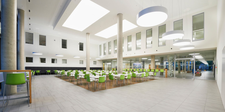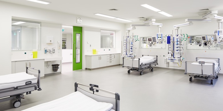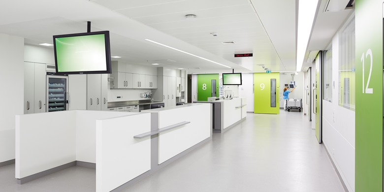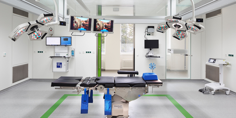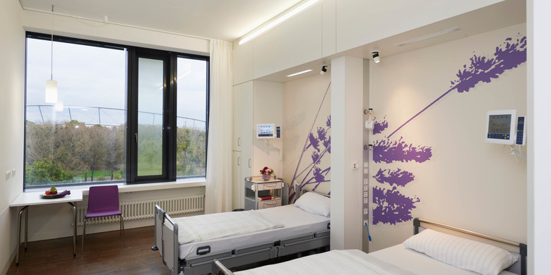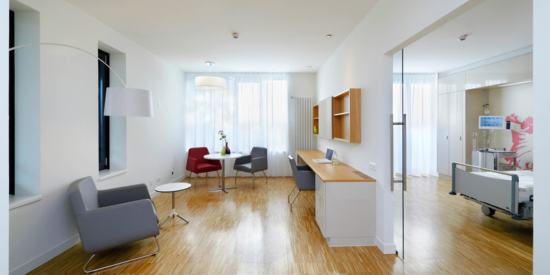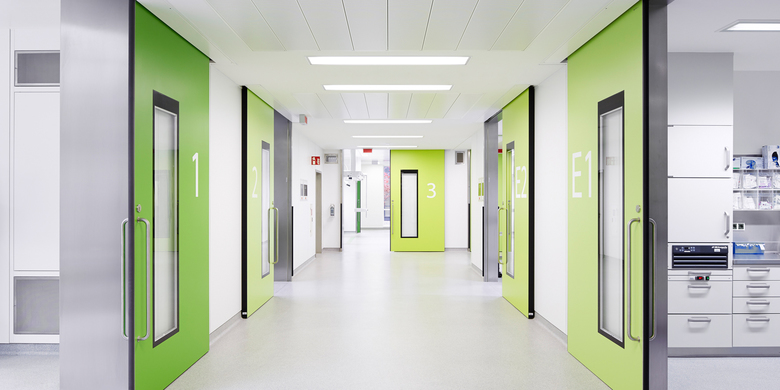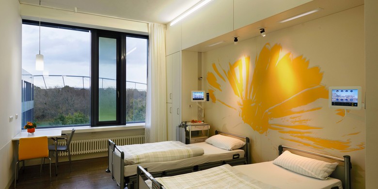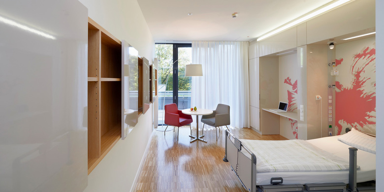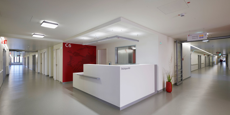 Die Pflegebereiche in den Obergeschossen mit über 110 Betten pro Ebene können an sich verändernde Bedürfnisse angepasst werden, ohne dabei an Funktionalität und Qualität zu verlieren. Eine Planung mit Standardraumkonzepten ermöglicht auch nach längerer Betriebsdauer des Krankenhauses, Teilbereiche organisatorisch wie baulich umzuwidmen.