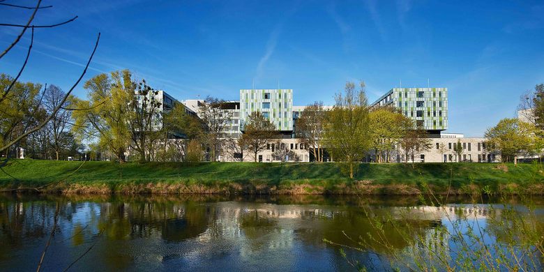 Erschlossen wird das Gesamtgelände durch die neu geschaffene Klinikallee, hier erreicht der Besucher den zentral gelegenen Haupteingang am neuen Klinikplatz. Dieser ist geprägt von dem historischen Altbau und zwei 150 Jahre alten Kastanienbäumen. Zentrum des Klinikums ist die lichtdurchflutete Eingangshalle. Im Inneren wird das Gebäude über eine Magistrale erschlossen, an der sämtliche Wartebereiche, Leitstellen und Erschließungen in die oberen Stockwerke liegen.