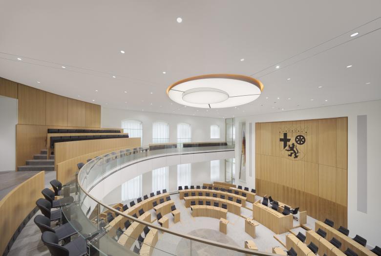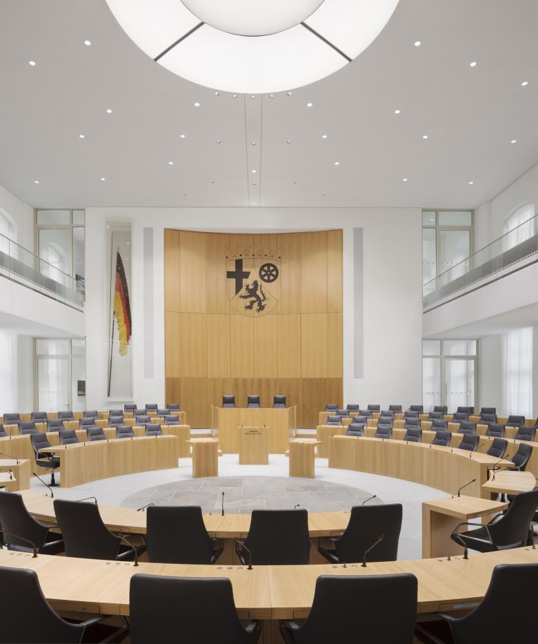Der Plenarsaal erhält eine neue Möblierung sowie eine barrierefrei erreichbare Tribüne für Presse und Besucher. Die historische Hambacher Fahne, die das Landtagsgebäude seit 1954 schmückt, wird so in den Neubau integriert, dass sie die identitätstiftende und demokratische Wirkung des Ortes unterstreicht. Neben dem Parlamentsbetrieb wird das Deutschhaus auch vielfältige Nutzungsmöglichkeiten für Kultur, Bürger und Politik bieten.