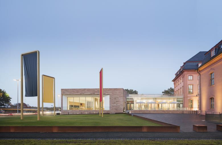 Mit seiner Fassade aus hellrotem Sandstein passt sich der moderne Anbau farblich dem historischen Bestand an. So entsteht ein harmonisches Ensemble, das dem Barockgebäude seine Würde lässt. Der Neubau korrespondiert gleichzeitig mit einem bestehenden Zwischenbau mit abschließendem Kubus auf der anderen Seite des Landtagsgebäudes, das im Rahmen der Sanierungsmaßnahmen die gleiche Sandsteinfassade wie der Neubau erhält. Durch die Wiederholung von Form und Material werden die Bauteile gestalterisch zusammengefasst.