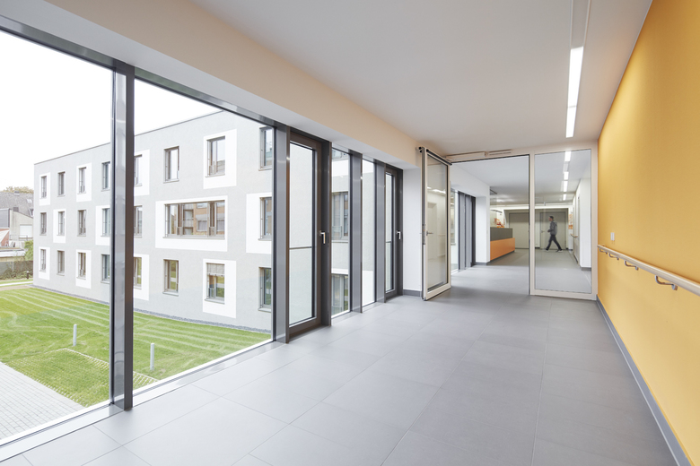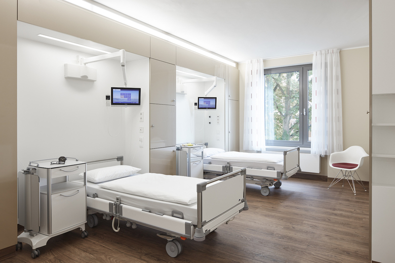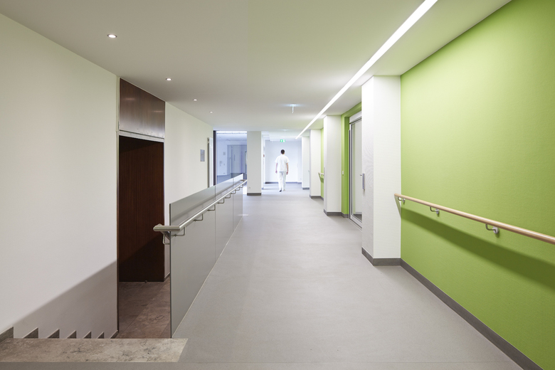 Die Geriatriestationen sind ebenerdig und im Obergeschoss des Neubaus untergebracht, hiervon neun Zimmer als Komfort-Zimmer für Privatkrankenversicherte. Eine interdisziplinäre Wahlleistungsstation für Innere Medizin und Chirurgie befindet sich im 2. OG. Mit einem hohen Anteil an 1-Bett Zimmern neben den 2-Bett Zimmern wird auf Patientenwünsche eingegangen. Im Erdgeschoss entsteht eine direkte Anbindung der Geriatrie an den Therapiebereich, neue Therapieräume sind eingerichtet. Diese sind gleichzeitig für logopädische Behandlungen ausgelegt. Der Neubau ist über den bestehenden Haupteingang und den direkten Zugang im Bereich der Liegendkrankenvorfahrt gut erreichbar.
