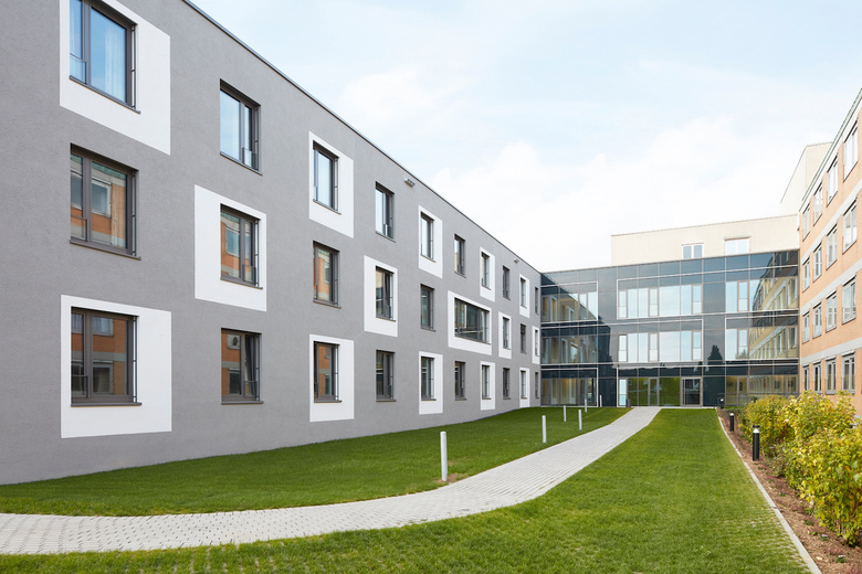Zwischen dem bestehenden Bettenhaus und der Schwesternschule orientiert sich der Erweiterungsbau zur straßenabgewandten, ruhigen Gartenseite. Grünflächen mit neuen Wegen um den Neubau und durch den Park laden zum Spazieren und Verweilen ein.