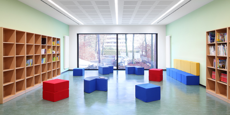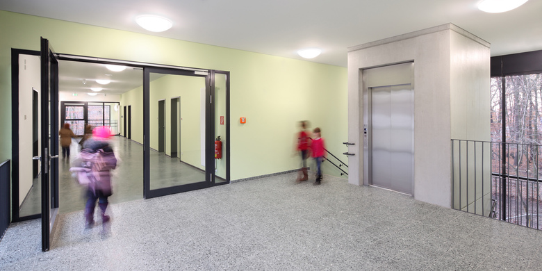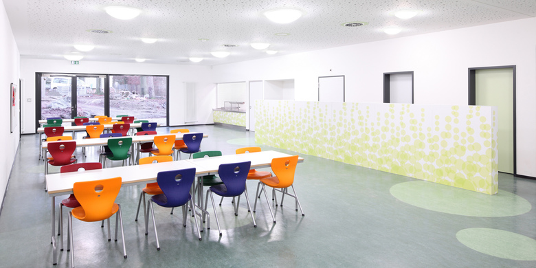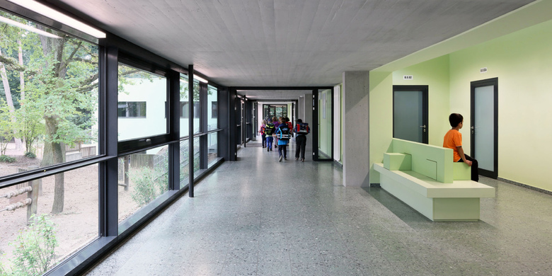 Ein zum Bestandsbau gehörender Pavillon wurde schadstoffgerecht entsorgt und danach komplett abgebrochen. Um den Anforderungen an eine künftige Ganztagsschule gerecht zu werden, wurde ein neuer Baukörper in Passivhausbauweise errichtet und in die Gesamtanlage integriert.