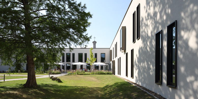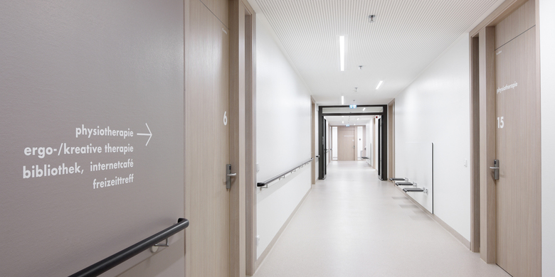 Die ehemalige Außenfassade der Kapelle wurde durch den Neubau zur Innenwand umfunktioniert und begrenzt heute Eingangshalle sowie Cafeteria, eine Glasfuge dient der natürlichen Belichtung der Magistrale und der Kapellenfassade mit ihren Buntglasfenstern. Die Kapelle ist nun Mittelpunkt der Gesamtanlage am Kreuzungspunkt zur Quermagistrale, die das Gebäude für die Verwaltungs- und Therapieeinheiten mit den vier Bettenhäusern verbindet.