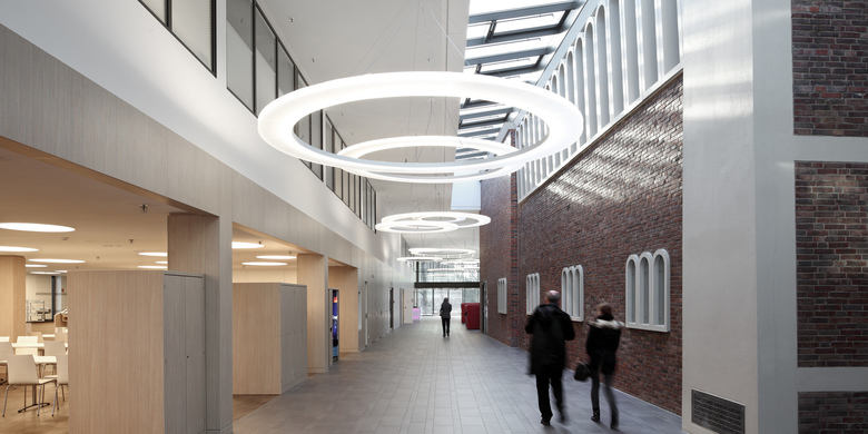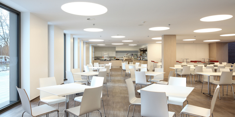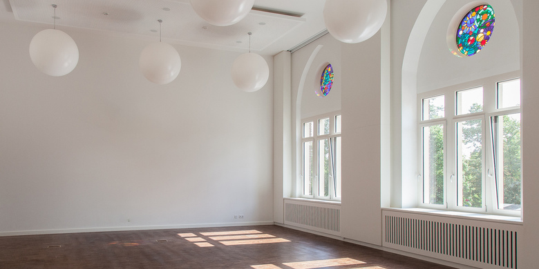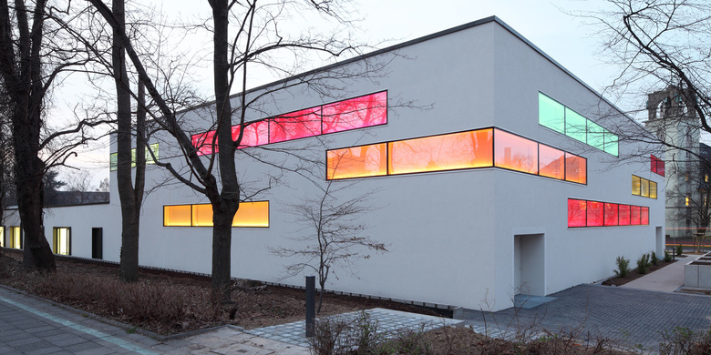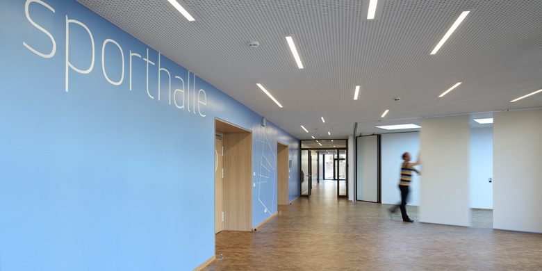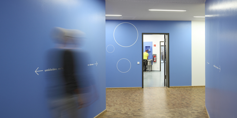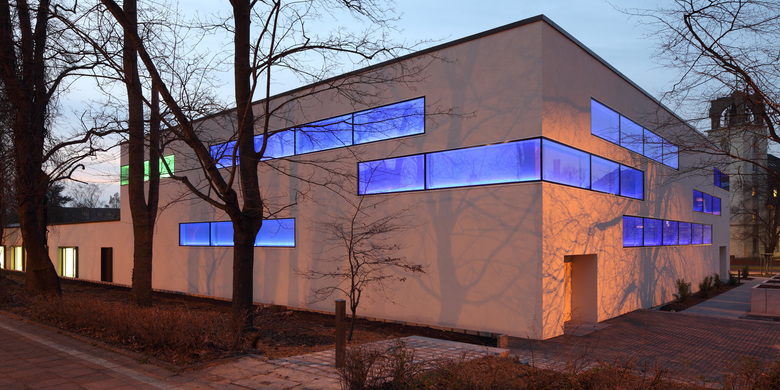 Da die Halle auch für Versammlungen und Symposien genutzt werden soll, spiegelt sich dieser Anspruch auch im Beleuchtungskonzept wider: Die Fensterbänder des Gebäudes können mit farbigem Licht bespielt werden können, über in die Fenster integrierte LED-Linien lässt ich die Beleuchtung individuell an jede Veranstaltung anpassen. Farbigkeit, Brenndauer sowie Auf- und Abblendvorgänge können je Fensterband getrennt reguliert und gesteuert werden, wodurch immer neue, stimmungsvolle Licht-Szenen entstehen.