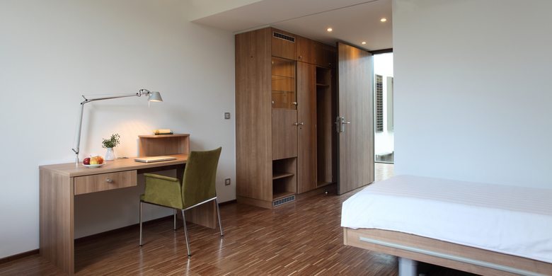 Die Innenräume sind geprägt von hellen, freundlichen Materialien, die eher an ein Hotel als an eine Klinik erinnern, sämtliche Möbel sind in Material und Farbe auf die Innenarchitektur abgestimmt. Die Bäder besitzen mit ihren großformatigen, hellen und dunklen Wand- und Bodenfliesen ebenfalls Hotelcharakter. Große Spiegel mit ansprechender Beleuchtung schaffen ein Wohlfühlambiente.