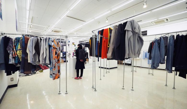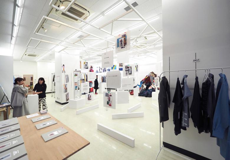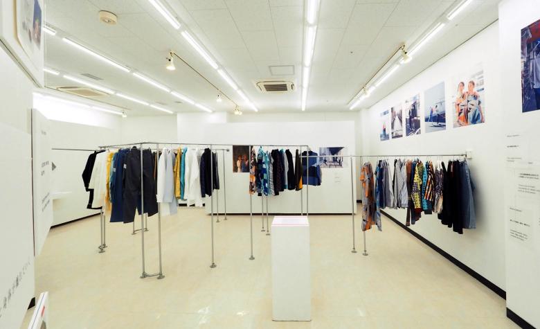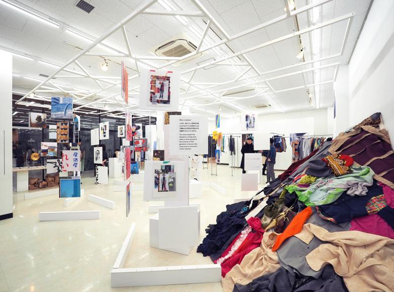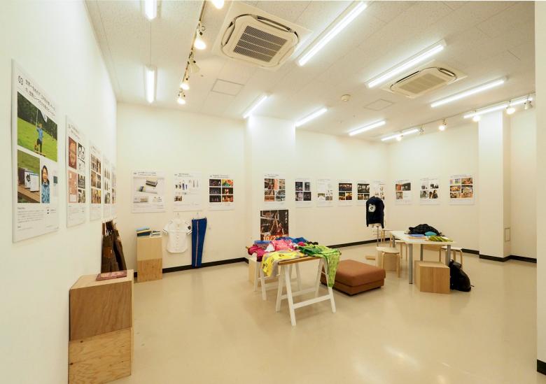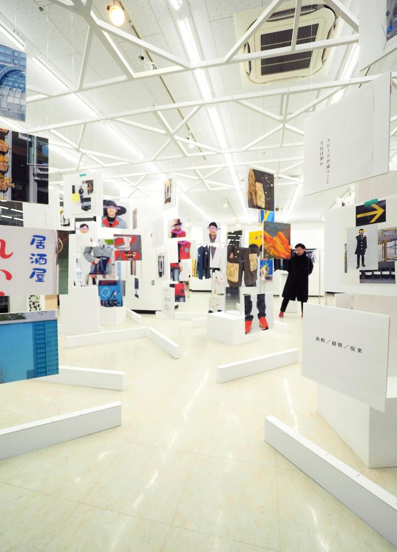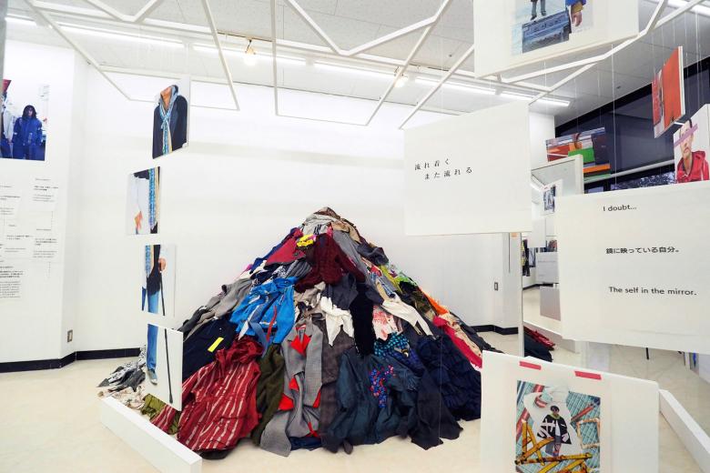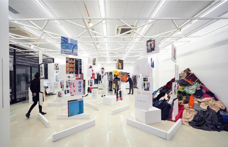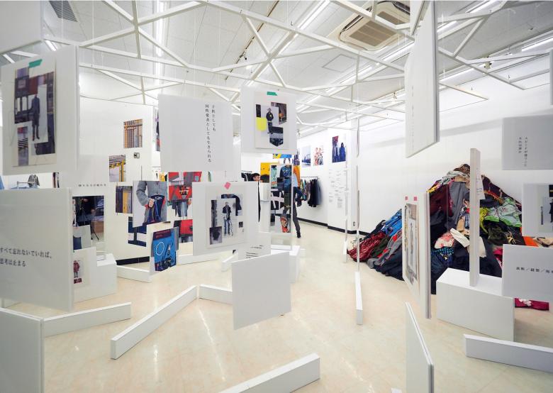 矢内原充志が横浜黄金町で行ったアート活動を中心に、ファッションデザイン、旅館のプロデュースといった様々な活動を紹介する展覧会の会場構成。