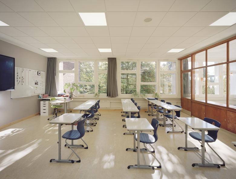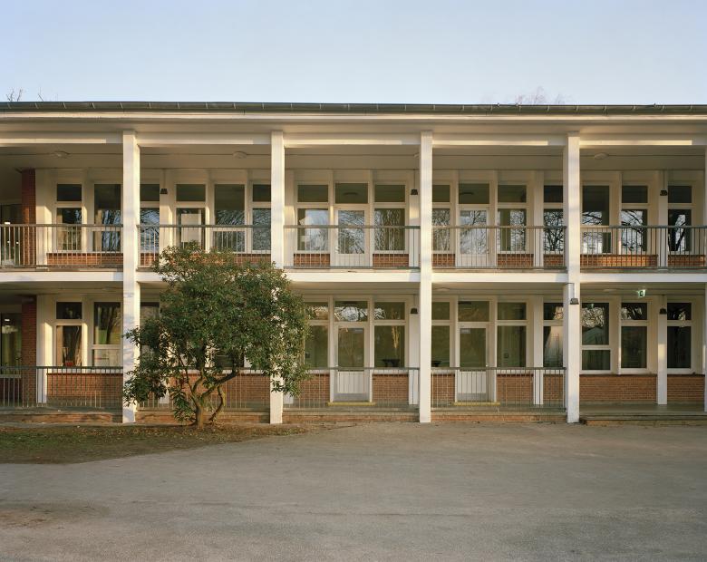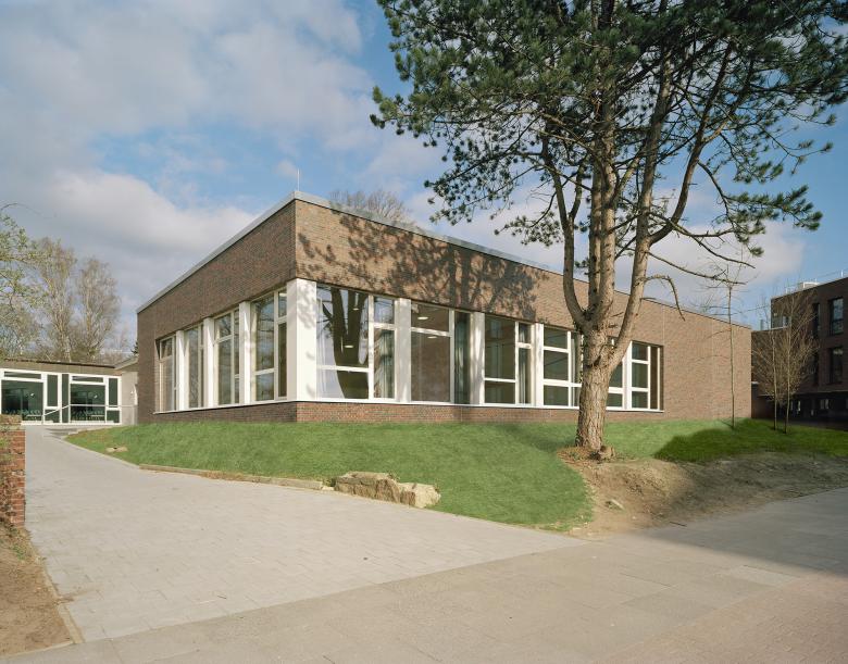 Die bestehende Pausenhalle wurde zur Mensa mit Vitalküche umgebaut, während die neue Pausenhalle als soziales Zentrum dient. Besonderer Wert wurde auf den Erhalt der prägenden Backsteinfassaden und der Bestandsstruktur gelegt. Farb- und Materialkonzept knüpfen an die Architektur der 1950er- und 1960er-Jahre an und verbinden Bestandsgebäude und Neubauten zu einem stimmigen Ensemble. Innen sind helle und offene Räume entstanden, die Kunstgalerie in den Wandelgängen bietet Fläche für die Werke der Schüler:innen.