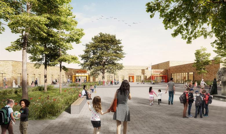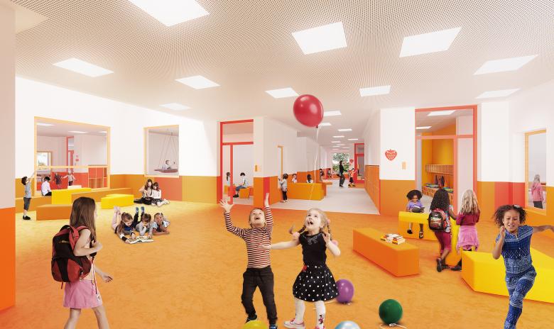 Der Stadtteil Mühlenberg im Süden Hannovers erhält mit dem Ersatzneubau der Grundschule ein zentrales Bildungs- und Gemeinschaftszentrum. Der Entwurf greift die kulturelle Vielfalt des Stadtteils auf und schafft einen interkulturellen Marktplatz als Ort der Begegnung. Dieser neue Begegnungsort stärkt die bestehenden Qualitäten der Umgebung und schafft einen geschützten und gleichzeitig offenen Raum, der die interkulturelle und inklusive Ausrichtung der Schule symbolisiert.