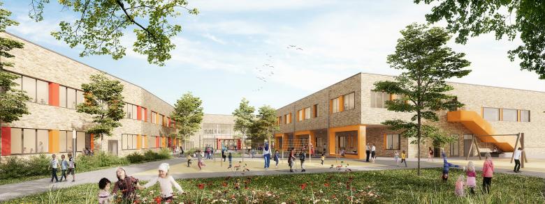 Der Neubau ist funktional in zwei Bauabschnitte gegliedert: Zunächst wurde die Grundschule mit Forum, Foyer, Mensa und Aula im nördlichen Teil errichtet, gefolgt von der Sporthalle und dem Familienzentrum im Süden. Die Anordnung der Funktionen schafft eine Staffelung von öffentlichen hin zu halböffentlichen und privaten Bereichen. Die unterschiedlichen Gebäudeteile sind durch eine zentrale Erschließungsspange verbunden, die als Rückgrat und verbindendes Element fungiert. Die Fassaden des Neubaus bestehen aus beigem Klinker, der durch unterschiedliche Farbakzente die verschiedenen Nutzungsbereiche sichtbar macht und die Identifikation der Nutzer:innen mit dem Gebäude unterstützt.
