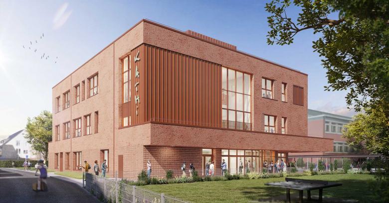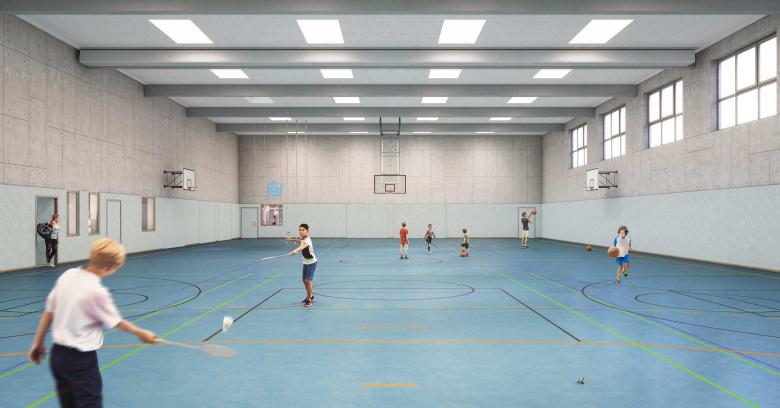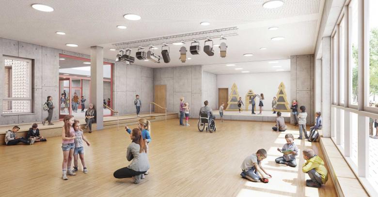Während sich die Grundschule als geschützter Lern- und Lebensraum für die Jüngsten versteht, bietet der Erweiterungsneubau der Katharina-Henoth-Gesamtschule ein offenes, urbanes Lernumfeld für die 9. Klassen der Gesamtschule. Die Sporthalle mit Zweifeldhalle und die Wohnungen für die Hausmeisterei ergänzen den Campus zu einem zukunftsfähigen Schulstandort. So entsteht ein vielfältig genutzter Bildungsstandort, der Austausch ermöglicht, ohne die Eigenständigkeit der Schulen aufzugeben.