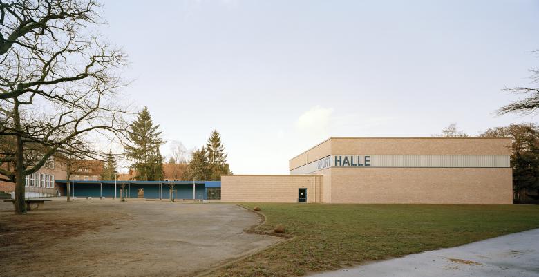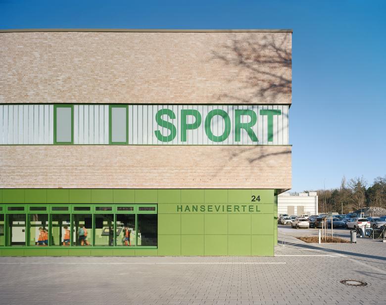 Ein markantes Fassadenkonzept verbindet die Hallen optisch durch umlaufende Fensterbänder und gezielte farbliche Akzentuierungen. Die detaillierte Klinkerfassade mit reliefiertem Sockelbereich unterstreicht die unterschiedlichen Nutzungszonen. Besonders bei der Dreifeldsporthalle im Hanseviertel wird dieses Konzept deutlich sichtbar: Der Baukörper ist klar gegliedert in einen eingeschossigen Sockel für die Nebenräume und ein leicht zurückgesetztes Obergeschoss, das den Hallenteil beherbergt.
