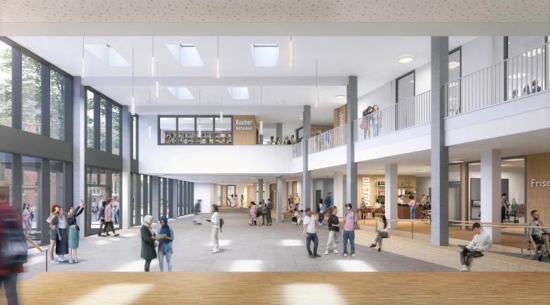 Die zentrale Eingangshalle ist als offene »Markthalle« konzipiert. In ihr erhält jedes Cluster einen eigenen Raum mit einer Art Schaufenster, das Einblicke in die verschiedenen Fachbereiche ermöglicht. Die Halle bietet Raum für Schulveranstaltungen, Konferenzen und Prüfungen. Treppen- und Sitzstufen laden zum Verweilen und Treffen ein. Die transparente Architektur ermöglicht Sichtbezüge zwischen den Geschossen und schafft eine Atmosphäre, die den lebendigen Schulalltag widerspiegelt.