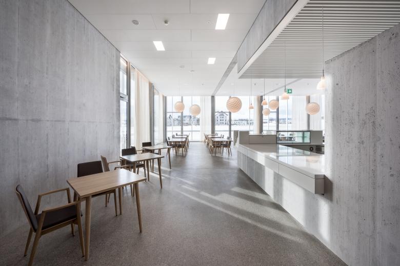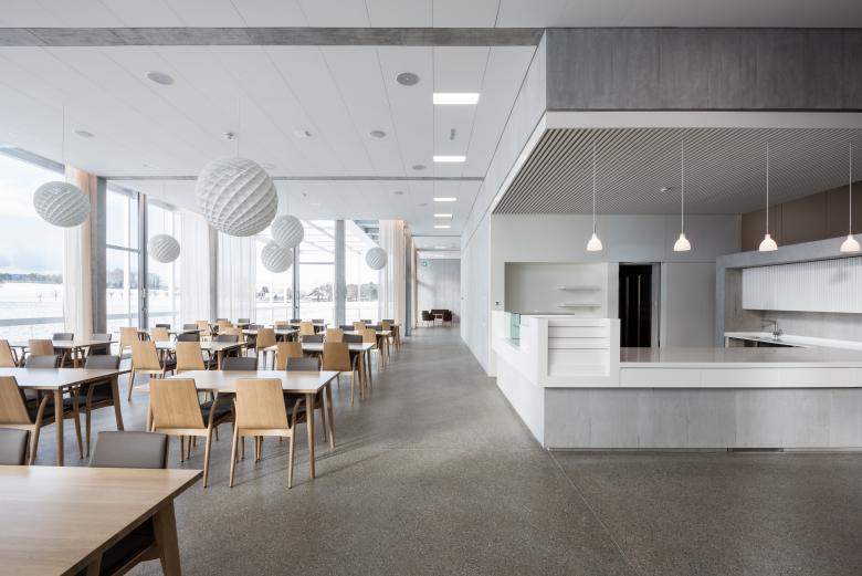 Das Gebäude wird durch einen grosszügigen Empfang betreten, von wo aus das anschliessende zentrale Treppenhaus direkt alle Abteilungen erschliesst. Eine grosse einladende Treppe führt ein halbes Geschoss tiefer in die öffentlichen Bereiche des Neubaus mit direktem Zugang zum Aussenraum. Nebst einem neuen, grosszügig angelegten Restaurant befinden sich hier auch die Veranstaltungsräume sowie der Bibliotheks- und Cheminéebereich. Durch die Ausrichtung der Gesellschaftsräume nach Westen schafft man einen natürlichen Übergang ins Grüne.