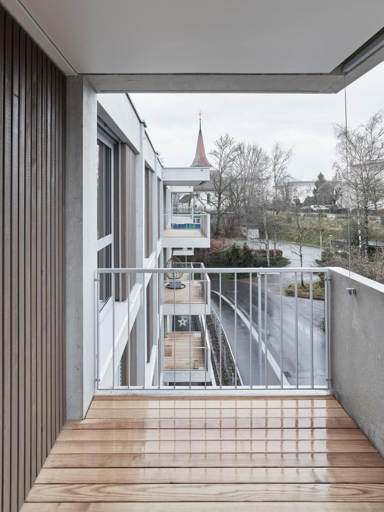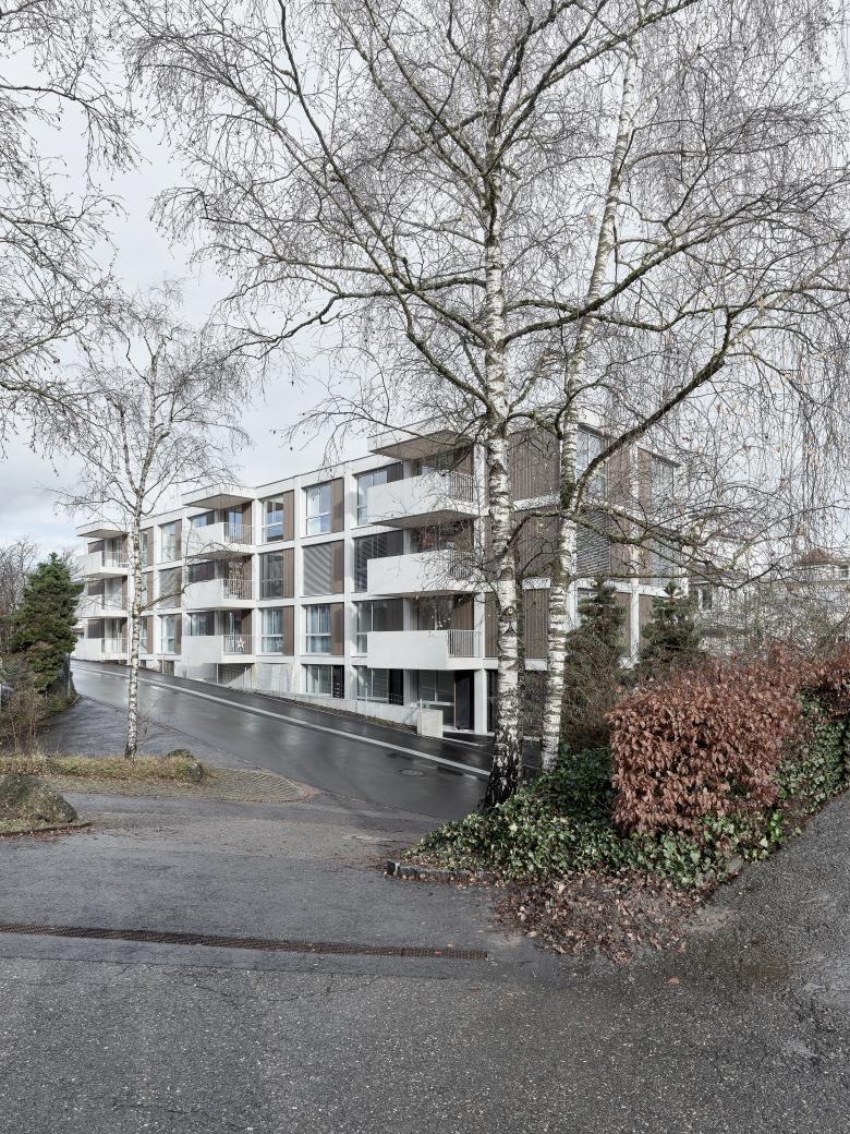 Der architektonische und strukturelle Auftritt des Gebäudes orientiert sich wesentlich an den ehemals industriell genutzten, durch die Abbildung ihrer Tagkonstruktion geprägten Gebäuden auf dem Papieri-Areal. Die Tragkonstruktion des Neubaus bildet sich nach Aussen hin in einem steinigen Betonraster ab. Dabei stehen die über alle Geschosse durchlaufenden Stützen den Deckenränder leicht vor. Der daraus entstehende Raster wird mit Füllungen aus Fenstern und Holzelementen versehen. Den jeweiligen Elementen vorgelagert werden geschosshohe vertikalen Holzlamellen angebracht. Teilweise werden ganze Rasterfelder mit festen Holzlamellenelemten den Fenstern im Bereich der Nassräume und dem Treppenhaus vorgelagert. Im Sockelgeschoss werden die Holzelemente in die offene Struktur gehängt, sodass die Parkierung immer natürlich belüftet ist. Die Holzelemente bilden in ihrer dunkelbraunen Erscheinung einen Kontrast zu den an Ort betonierten, hellen Stützen und Deckenränder, sodass sich die konstruktive Rasterstruktur schön herausbildet. Mit den ausspringenden Balkonen und ihren vorgehängten Betonscheiben wird die Privatsphäre der Wohnungen durch den direkten Sichtbezug zur Obermühlestrasse gewährleistet.