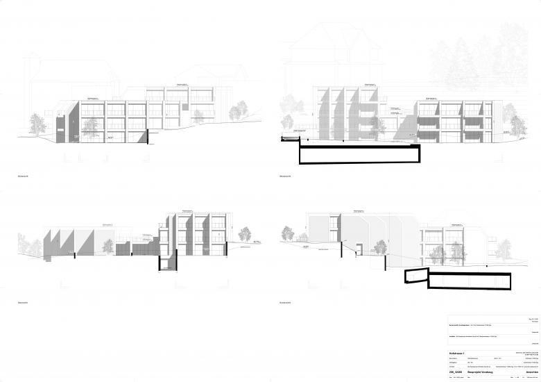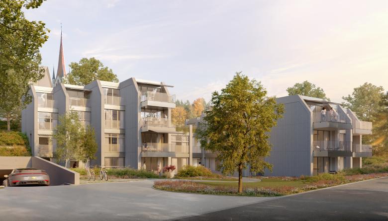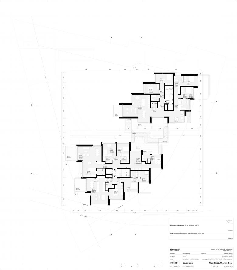 Die zwei bestehenden Wohnhäuser auf dem Grundstück sollen durch einen Neubau ersetzt werden. Auf Grund einer Dienstbarkeit im nordwestlichen Teil des Grundstücks wird der Neubau analog den Bestandsbauten in den südwestlichen und nordöstlichen Teil der Parzelle platziert. Im Nordwesten entlang der Hofstrasse wird so ein grosszügiger, parkartiger Zugangsraum zum Gebäude formuliert. Hier befinden sich neben dem Zugangsweg zum Gebäude die Vorfahrt mit der Ein- und Ausfahrt zur Tiefgarage, die Besucherparkplätze und die Kurzzeitabstellplätze für Velos sowie eine Frei- und Aufenthaltsfläche als Begegnungszone für die Bewohner.