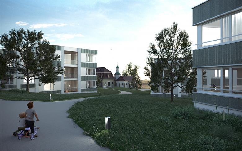 Die Stellungen der Häuser definieren sowohl zum See, als auch zum Berg hin immer wieder dreiseitig gefasste Aussenräume, welche sich auch in der Figur des bestehenden Hofs St. Karl gegen den See hin wiederfinden. Erschlossen sind die Häuser über ein einfaches Wegsystem, welches den Vorgaben des dem Bebauungsplan zu Grunde liegenden Umgebungsplan entspricht.