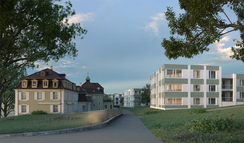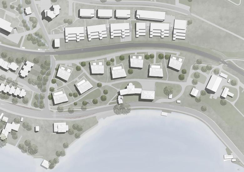Das Ensemble liegt in einer kleinen Seebucht entlang der Uferstrasse zwischen Zug und Oberwil. Die acht Neubauten setzen sich wie im Bebauungsplan definiert, präzise in die dafür angedachten Baufelder und formulieren durch ihre Setzung einen von Norden nach Süden hin durch das Gelände mäandrierenden Grünraum, der im Süden in das landwirtschaftlich genutzte Gelände übergeht.
