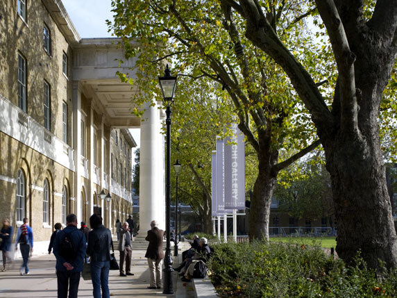 The grand classical brick and stone façade of the building has been refurbished by the landlord with the original sash windows replaced. The windows are lined internally but contain lighting which gives the building a warm glow in the evenings. The windows on the first floor gallery beneath the portico provide views of the original stone columns, the gallery signage banners and the green beyond.