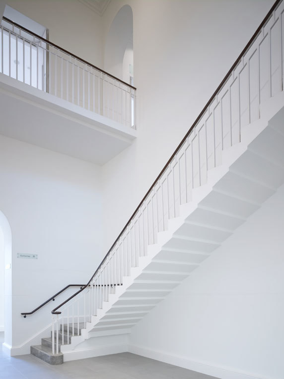 Within the existing building, four main galleries have been created on each of the three floors arranged around the original refurbished staircase, the terrazzo of which AHMM were delighted to retain. These galleries form a series of interconnecting spaces, exploiting the elegance of the large, well-proportioned rooms with ceiling heights of over 4m. Floor to ceiling openings created between the spaces provide the visitor with views through the length of the building: at some point on the first floor this equates to almost 200 feet (60.9m).