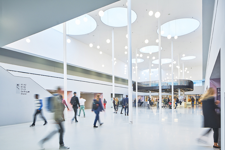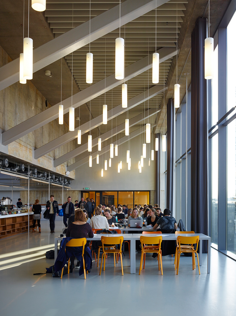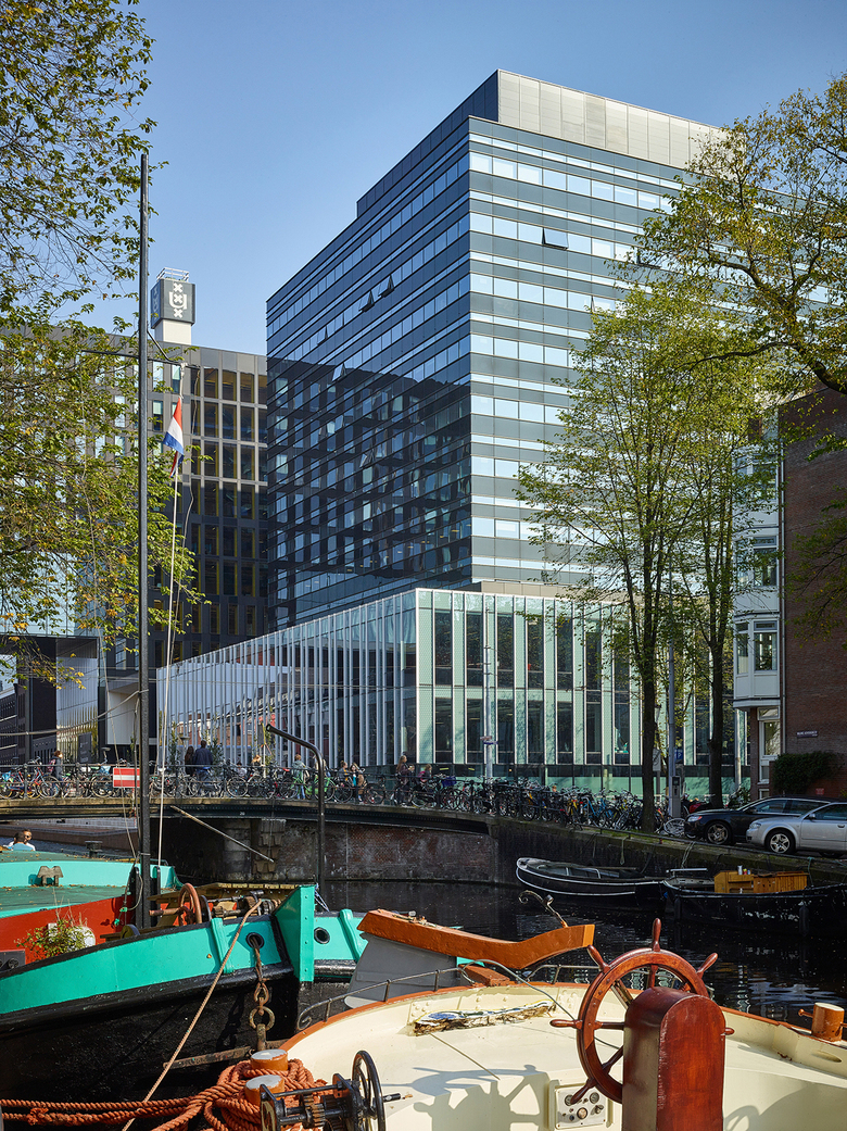 The University of Amsterdam (UvA) project remodels an uncompleted post-war academic campus in the heart of the Dutch capital, knitting its megastructural buildings back in to the city’s fabric, improving legibility and amenity for users and animating the street scene. The drama of an existing block spanning a canal is exploited by reshaping its form and opening up fresh views. Connections are made at ground level via a new bridge over this canal and a generous passage unifying disparate building entrances. Public rooms throughout further unlock its potential, whilst wholly new, carefully modulated facades assist navigation and identity and re-contextualise the buildings within their distinctive urban setting.