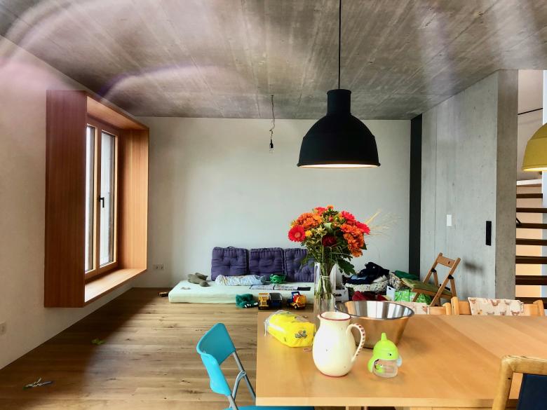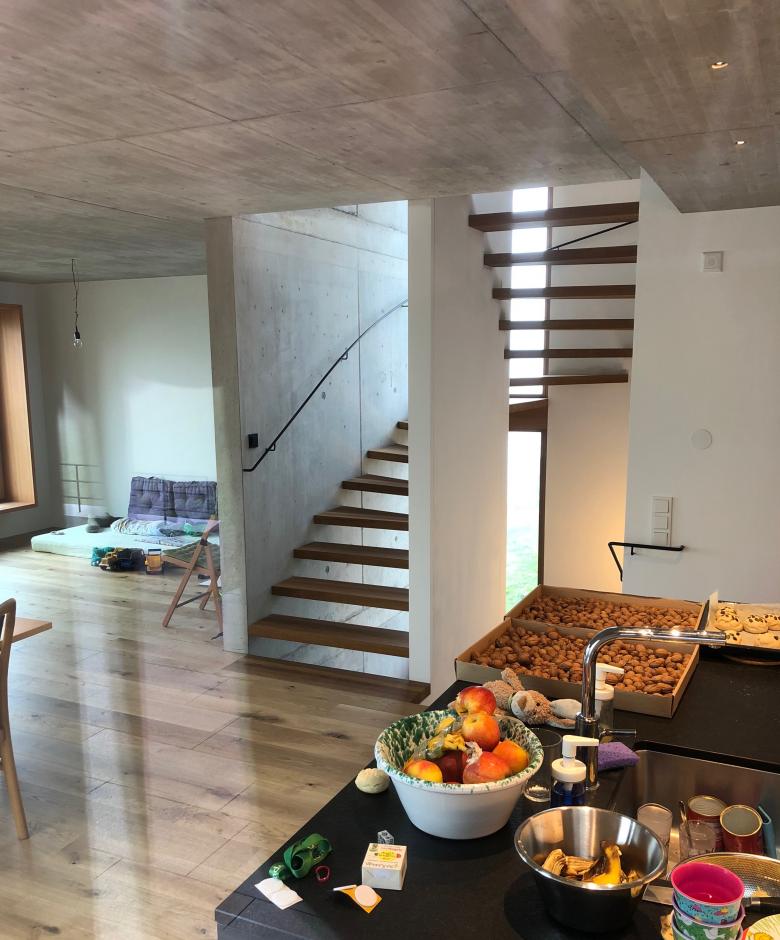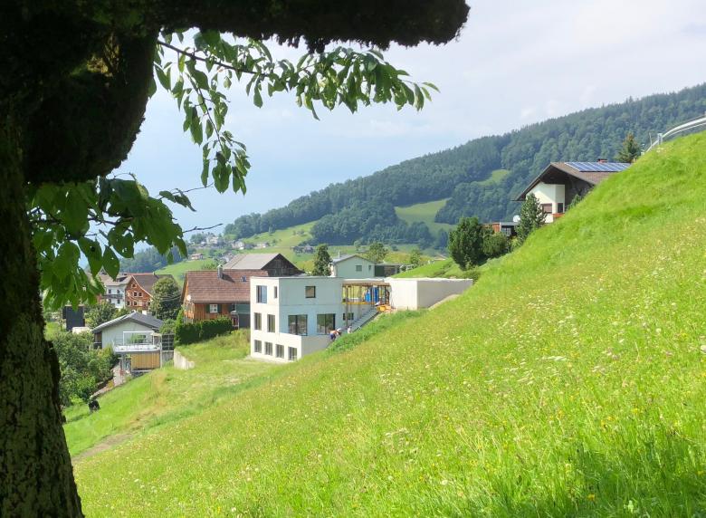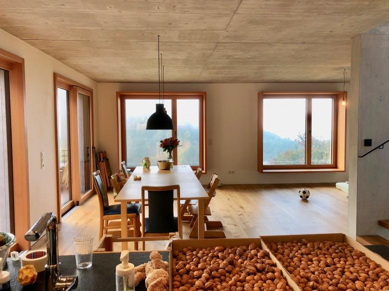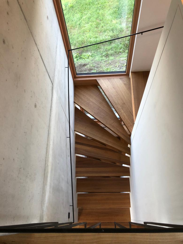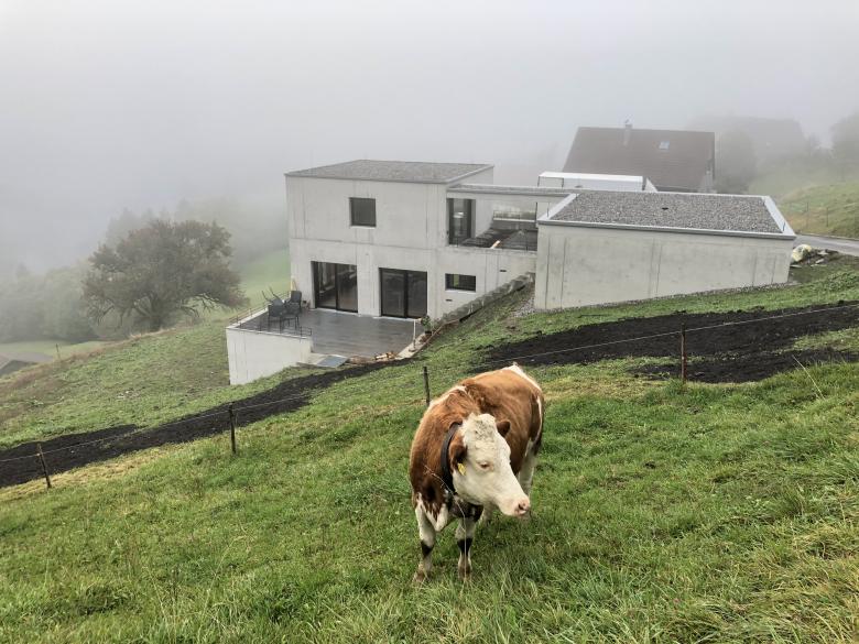 Das Einfamilienhaus besteht aus einem dreigeschossigen quadratischen Baukörper mit 7,17m Seitenlänge und einer freistehenden Doppelgarage. Durch die Grundrissanordnung bilden diese beiden Baukörper auf dem Hanggrundstück einen ebenen Vorplatz / Eingangshof. Alle Baukörper und Fassaden sind in Sichtbeton, Fensterrahmen aus Lärchenholz.
