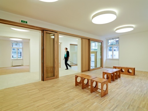 Der straßenseitige Teil des Vereinshauses "Austriahaus" der Pfarre Herz Jesu musste saniert werden. Im Eingangsbereich des großen Saales wurde eine mehrfach nutzbare Raumeinheit anstelle der freigewordenen Büroflächen geschaffen.