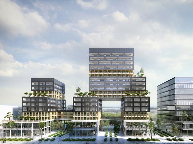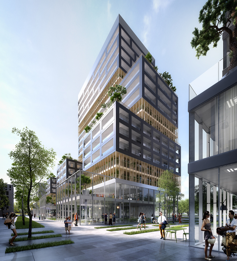 Euronantes project is located between the historic city center, the main railway station and the banks of the river Loire, and close to the island of Nantes. This new quarter corresponds to a growing population, an economic sector that seeks to maintain local employment as well as the development of start-ups, new technologies and sustainability. The plot E1 makes part of this ambition and aims to highlight the new offer in terms of quality of living. It is important to create urbanity on two levels: the quarter and the plot. It was our intention to develop a project that responds clearly to accessibility and attractiveness. The building is conceived with intelligence and generosity in an environment that is in a process of mutation. The base of the building hosts different activities and public facilities. Four pillars allow the necessary transparency in order to activate the ground floor. The upper volume that integrates the housing units is constituted by stacked “packages” differentiated by two kinds of facades: two levels are wood cladded and the next three levels by metal sheets. This variety in the treatment of the balconies highlights the generous and user-friendly aspect of the whole concept. The resulting terraces created by shifting the volumes allow the creation of green terraces and a smooth transition between the public and the private spaces. The building makes the most of the landscape and offer to each housing unit access or view to a green space.