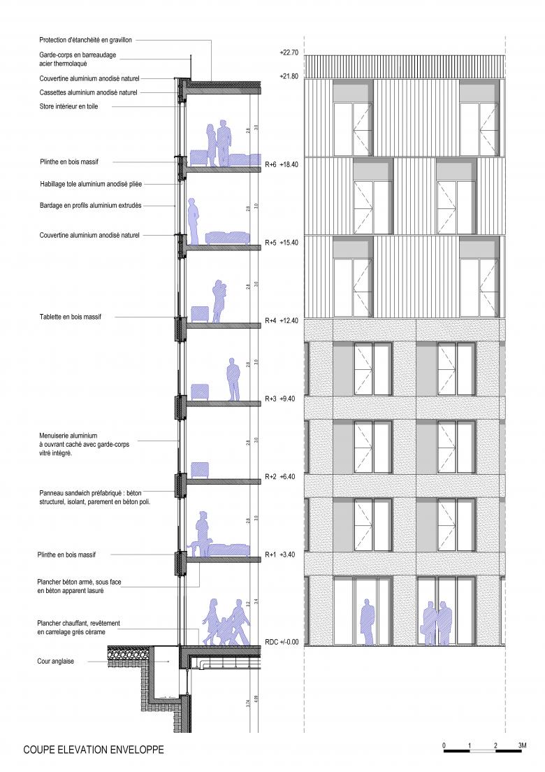 The design of the facades leaves visible the construction system of prefabrication and assembly of concrete pieces, with materials that are in light natural colours. The base is materialised by the regular design of the bays, which continues the classical order of the existing buildings. The use of polished concrete facing preserves the general luminosity of the site and ensures the durability of the structure. The attic completes the upper part of the foyer, in a recessed volumetry.