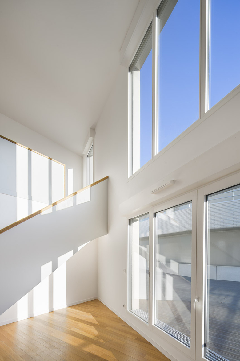 Our objective was to build high-quality collective housing. Each housing unit incorporates within it particular qualities of life, embodied by the balconies, the terraces, the patios, the large height of the spaces, the private gardens, the views, the multiple orientations... Our building seeks to transform its urban and construction constraints into veritable assets. Opening onto rue Marcel Bontemps with continuous, large bay windows, this tiered building is lined along its interior garden side with ample, free-running terraces. Located in the center of a dense urban area, the successive pulling back of the building’s structure creates the conditions in which a maximum amount of air and light is provided to each housing unit. The “landscape” of this building evokes the rich heritage of “Art deco” industrial buildings. And in paying homage to this epoch and the works of Henri Sauvage, the building, with its enameled plate façade, establishes a unique presence in the urban context of Boulogne-Billancourt.