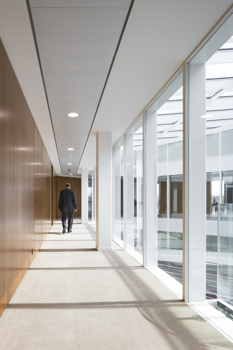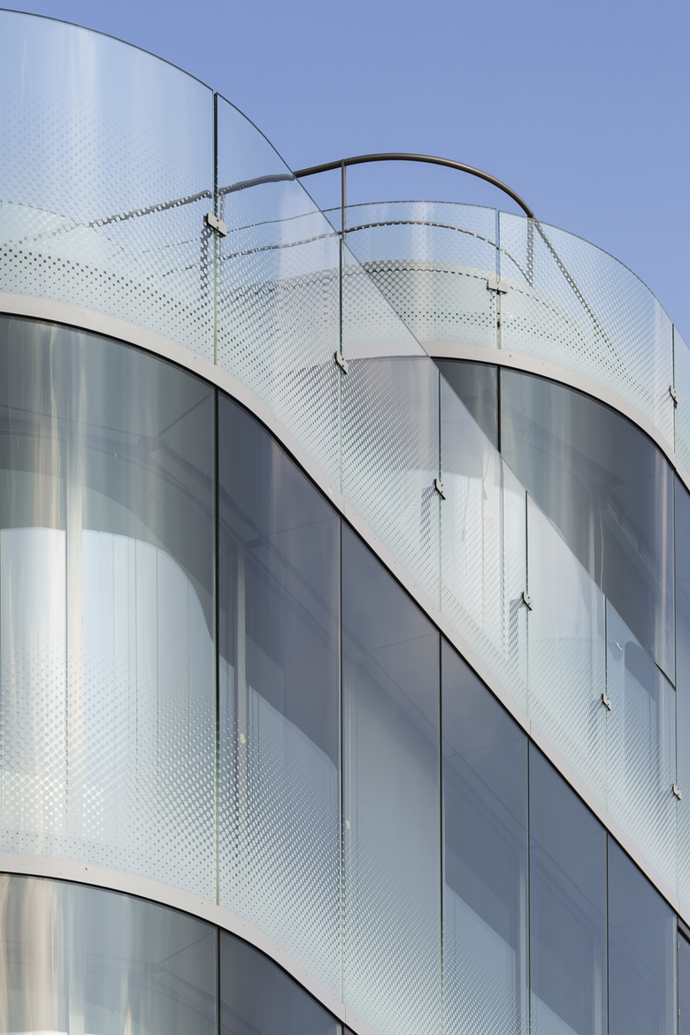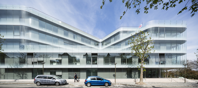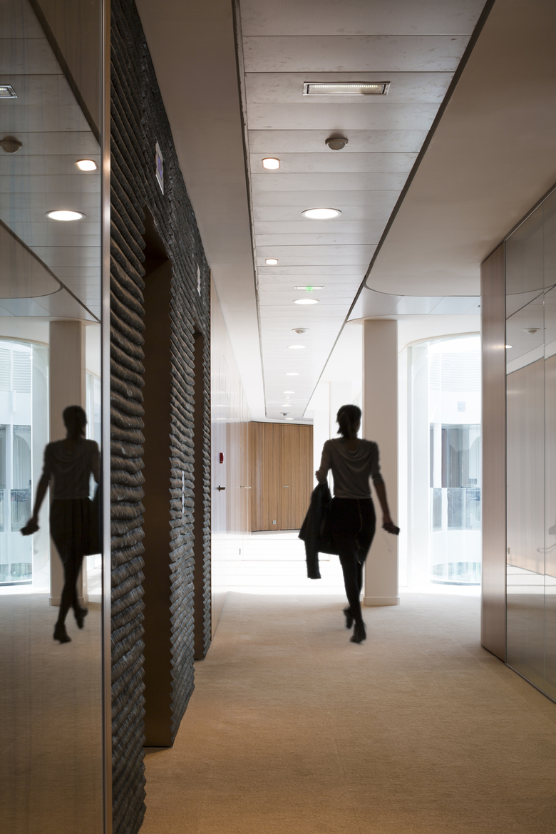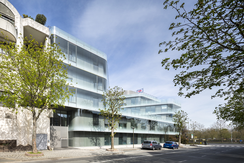Our intervention comprises three significant aspects that together come to define the project, imparting a new image to the whole: open working spaces, atriums and a new façade. The building’s initial form, with its floors distributed in two main directions, helped us reinvent it. Without departing significantly from this initial structural logic, we took advantage of it by devising loops in the layout of each level. This organization around a center allowed us to conserve a reduced number of security exits and stairwells, while respecting fire regulations. The cutting out of vertical openings in the middle of each floor allows natural light to reach the heart of the building. The rounded form of the floors transmits ’softness’ to the facades as well as to the building’s integral final volume, allowing it to come up to the street at a harmonious and elegant angle. Two ventilation spaces are present at the heart of the floors; empty square meters not lost, but functioning. Technically designed to meet the building’s requirements for good sound and thermal insulation, the façade is distinguished aesthetically on its lower windows with a silkscreen of waves approaching the shore.
