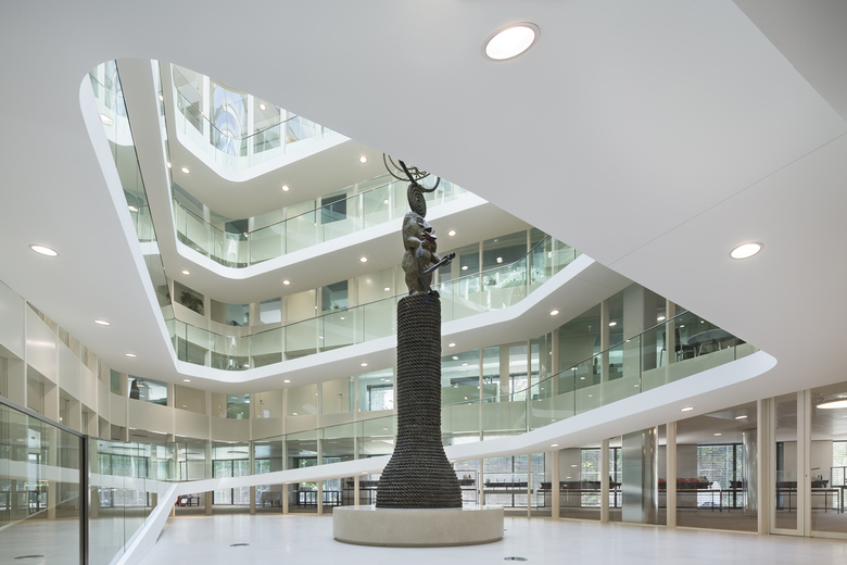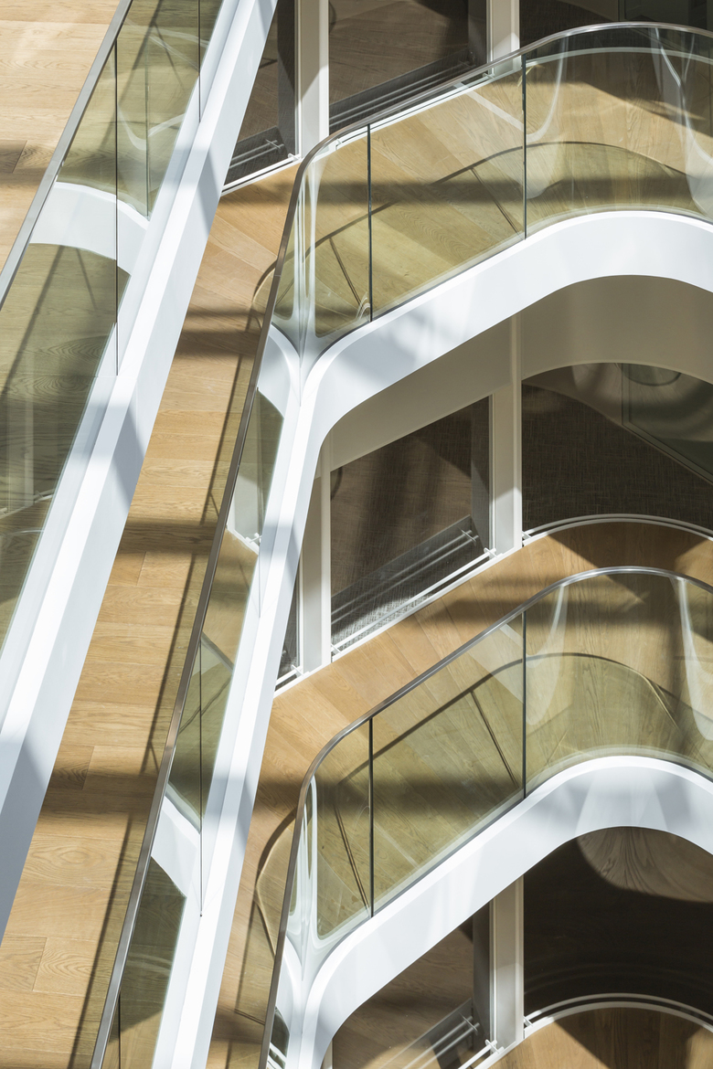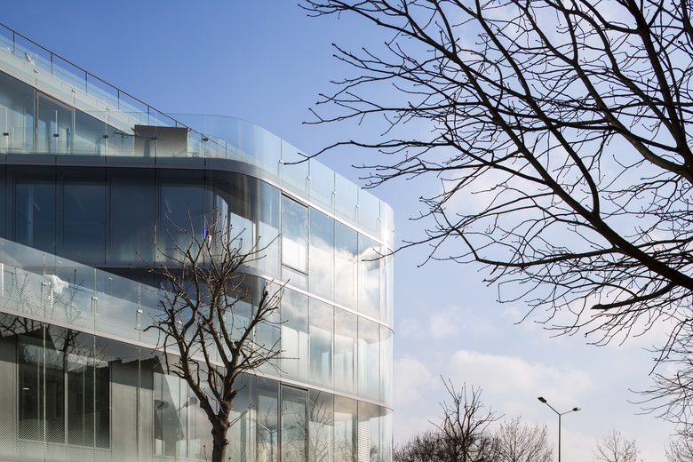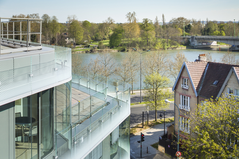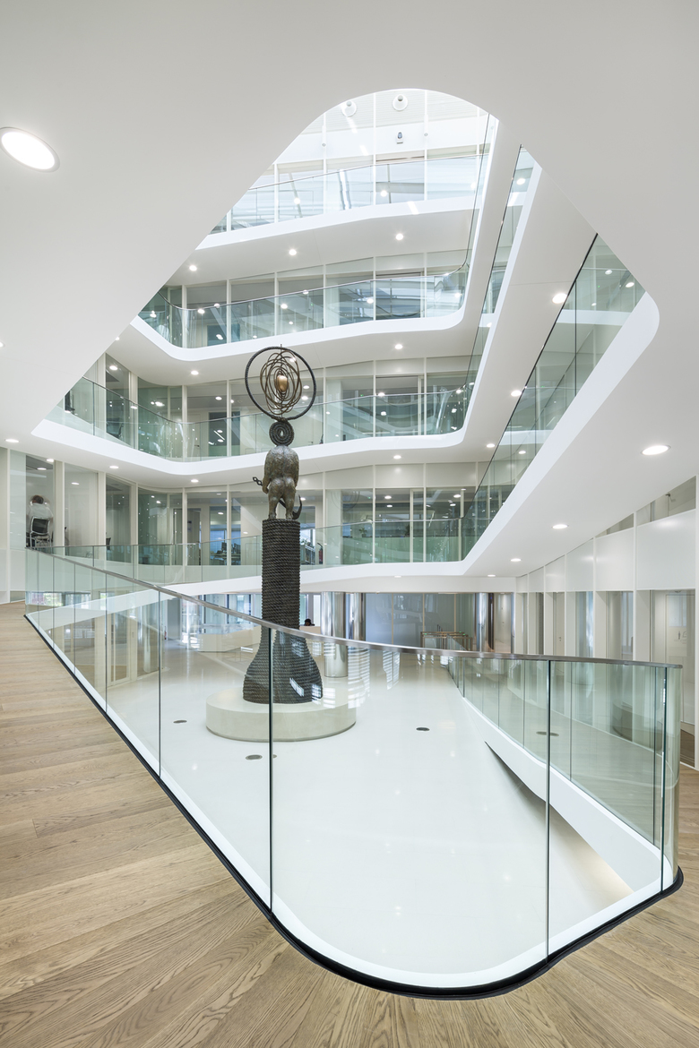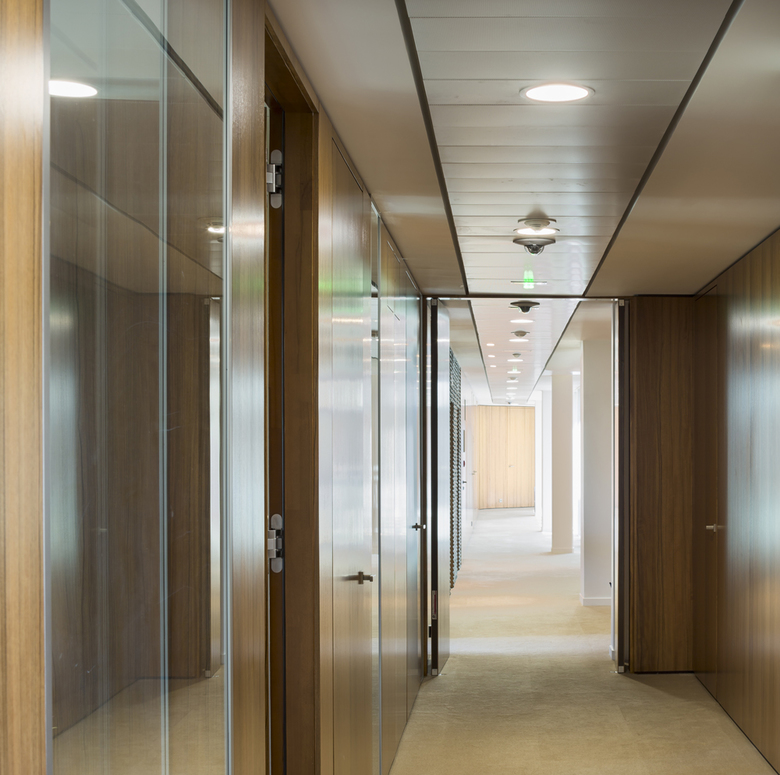 Our intervention comprises three significant aspects that together come to define the project, imparting a new image to the whole: open working spaces, atriums and a new façade. The building’s initial form, with its floors distributed in two main directions, helped us reinvent it. Without departing significantly from this initial structural logic, we took advantage of it by devising loops in the layout of each level. This organization around a center allowed us to conserve a reduced number of security exits and stairwells, while respecting fire regulations. The cutting out of vertical openings in the middle of each floor allows natural light to reach the heart of the building. The rounded form of the floors transmits ’softness’ to the facades as well as to the building’s integral final volume, allowing it to come up to the street at a harmonious and elegant angle. Two ventilation spaces are present at the heart of the floors; empty square meters not lost, but functioning. Technically designed to meet the building’s requirements for good sound and thermal insulation, the façade is distinguished aesthetically on its lower windows with a silkscreen of waves approaching the shore.
