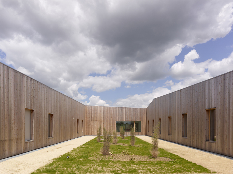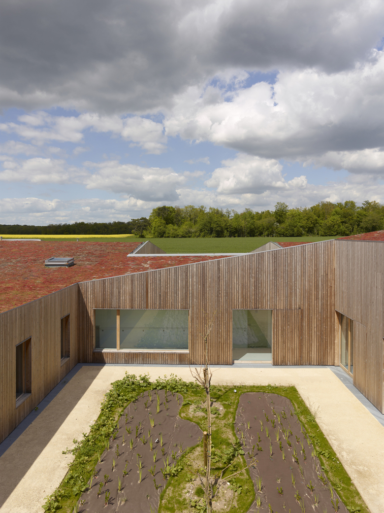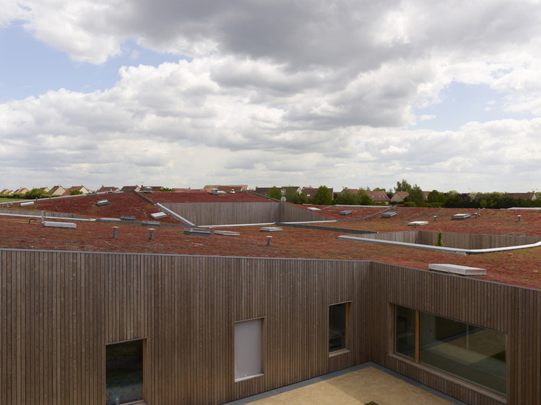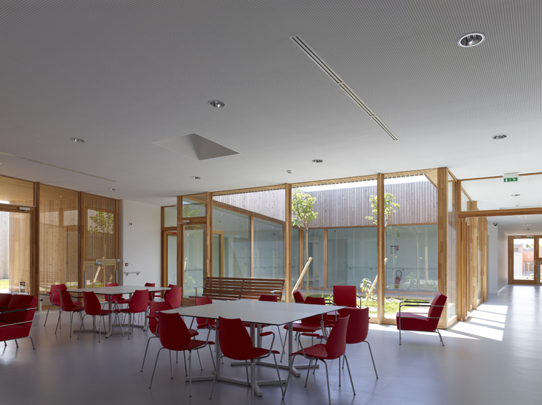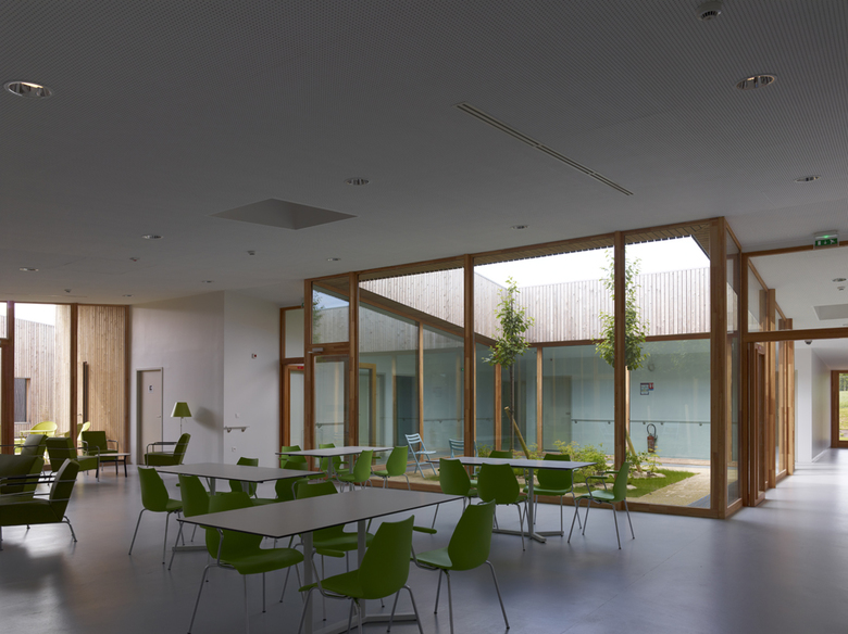There are six internal courtyards situated within the four unit complex: two large communal gardens of 350m2, with four others interior to each unit, which light the way of the paths toward the rooms. The large open garden, accessible to all, is located in the eastern part of the grounds. The precise network that irrigates these different recreation spaces is not merely reduced to the function of a link. The passageway, which creates an efficient distribution of space, expands, transforms, varies: sometimes in the half-light, sometimes in broad daylight, it alters according to the space it runs alongside; now rounded and harmonious, now straight and narrow. The palette of materials and colors also contains this diversity. Thus the space of the passageway is invigorated, becoming favorable to spontaneous action, to meetings, to sensory requests.